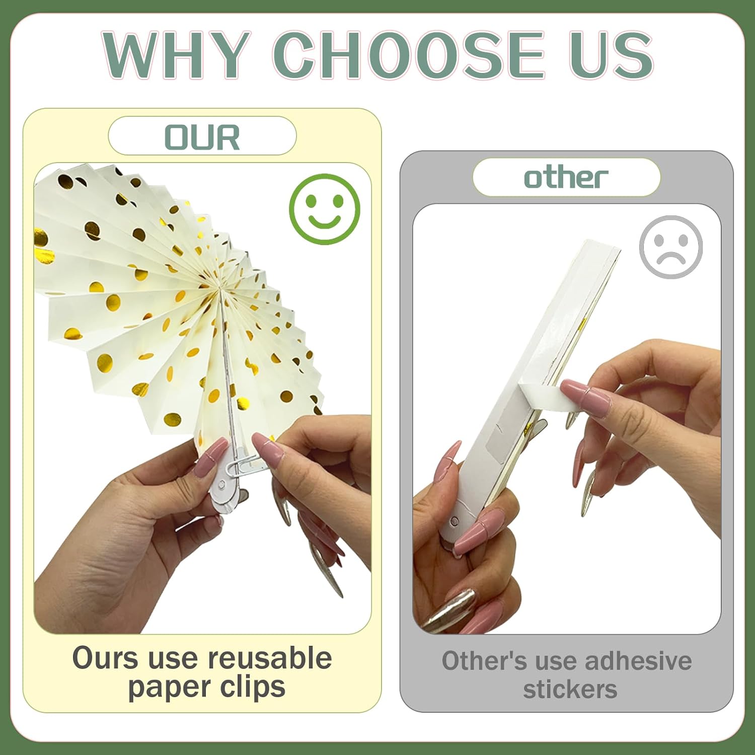- 【Material】: Our sage green and peach paper lanterns are made of quality thin paper and wire bracket. They are lightweight and biodegradable, and effortless to hang and store. More environmentally friendly than traditional balloon decorations. Meanwhile, compared to other paper fans party decorations that use adhesive stickers, our hanging paper fans all use reusable paper clips.