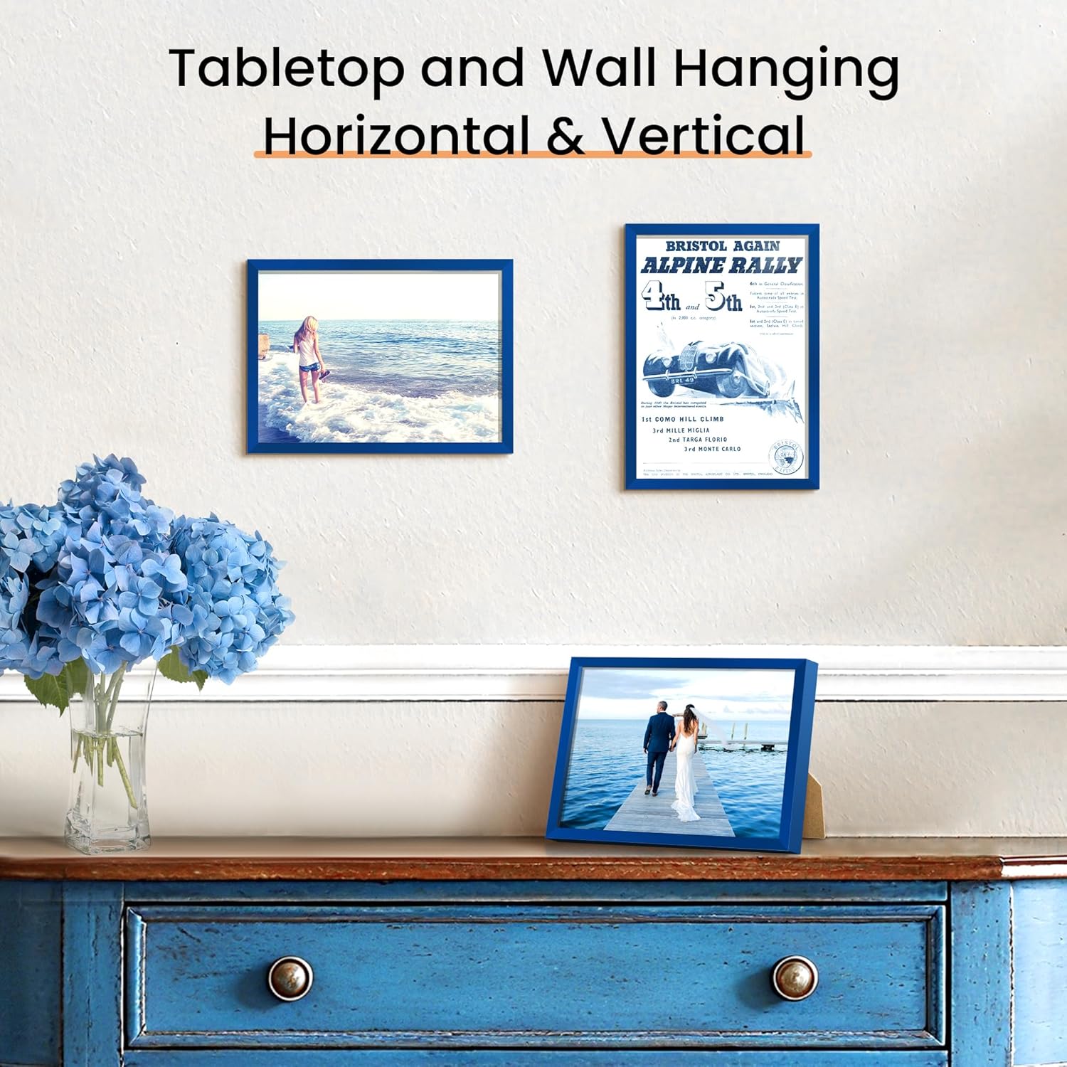 - Size: One wall blue photo frame fits 5x7 photo without mat, can be hung horizontally or vertically.