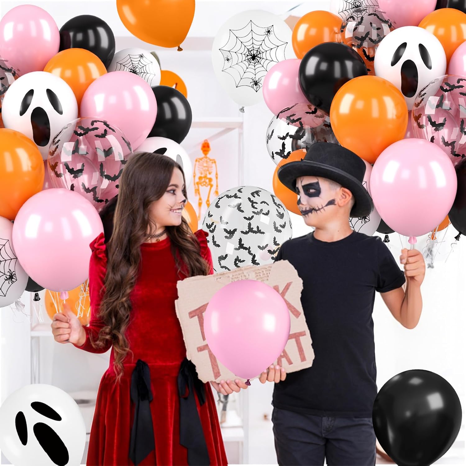 Pink Black Halloween Balloons Set, 50 Pcs White Spider Print Balloons, 12 Inch Pastel Pink Black and Orange Balloon Bat Confetti Balloon for Halloween Girls Night Decorations