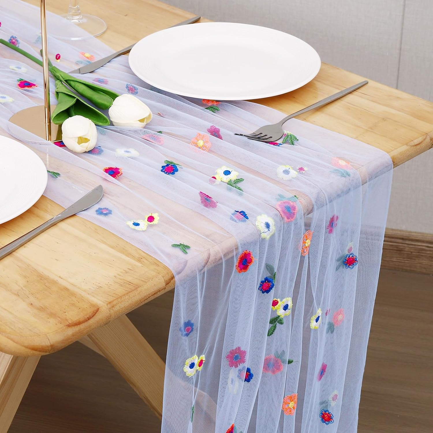 Blue Floral Table Runner 10 FT, Embroidery Daisy Table Runners Seasonal Sheer Tulle Table Runner for Thanksgiving Wedding Birthday Baby Shower Party