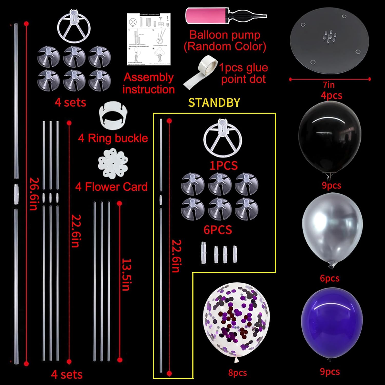- Included Components : Balloon Arch, Black Silver Purple Confetti Balloons, Filling Pump, Glue, Tying Tool