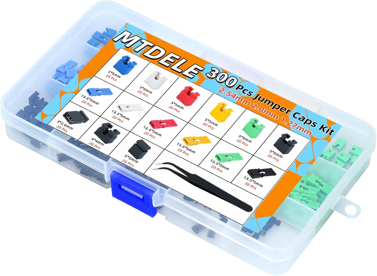 - Included Components : 300Pcs Jumper Caps Kit 2.54mm 2.0mm 1.27mm;1Pcs Tweezers