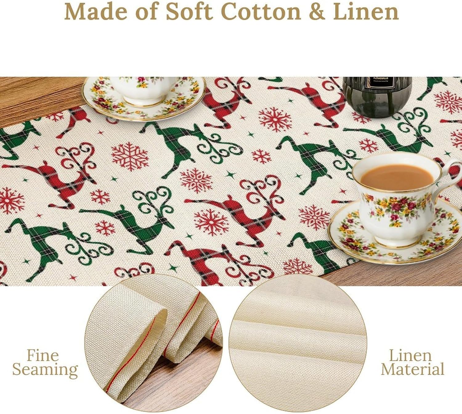 Christmas Table Runner,Christmas Plaid Deer Print Farmhouse Table Cloth Kitchen Dining Table Decoration for Home Party Decor 13x90 Inch