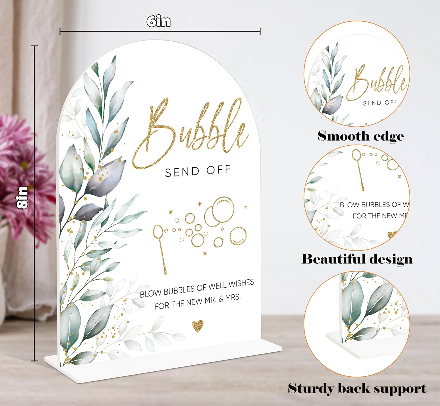 Acrylic Wedding Signs, Greenery Theme Bubbles Send Off Sign, Wedding Reception Signage, Bridal Shower Table Decor with Stand, Engagement, Anniversary, Newlywed Events and Parties Supplies, 14