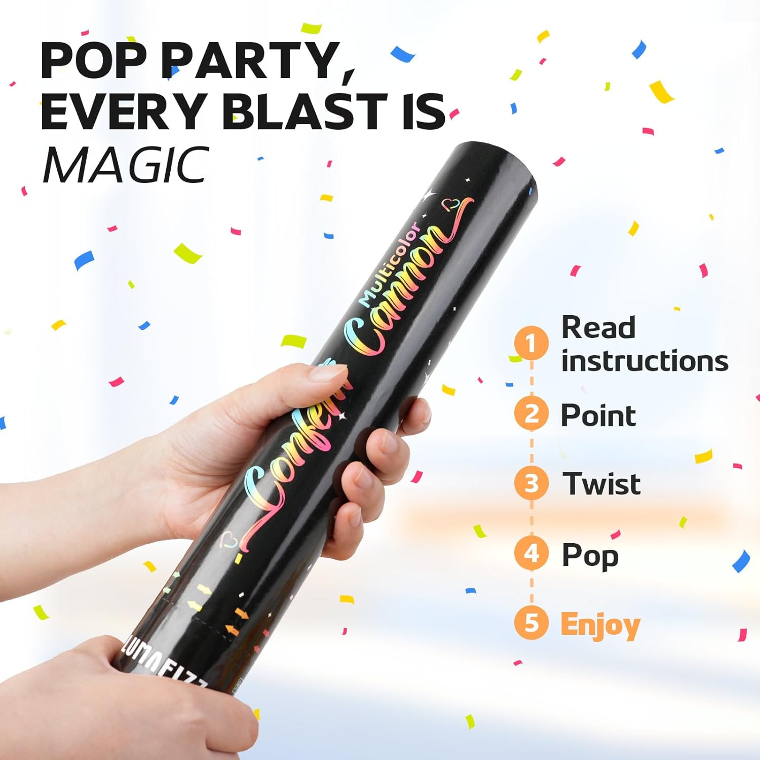 - 【EASE OF USE】No buttons, batteries, or pyrotechnics know-how for your Confetti Cannon. Just grip, give a firm twist—like cracking a supercharged glow stick—and feel the barrel kick. A stadium-worthy “POP!” rings out, kicking off your Confetti storm right away.