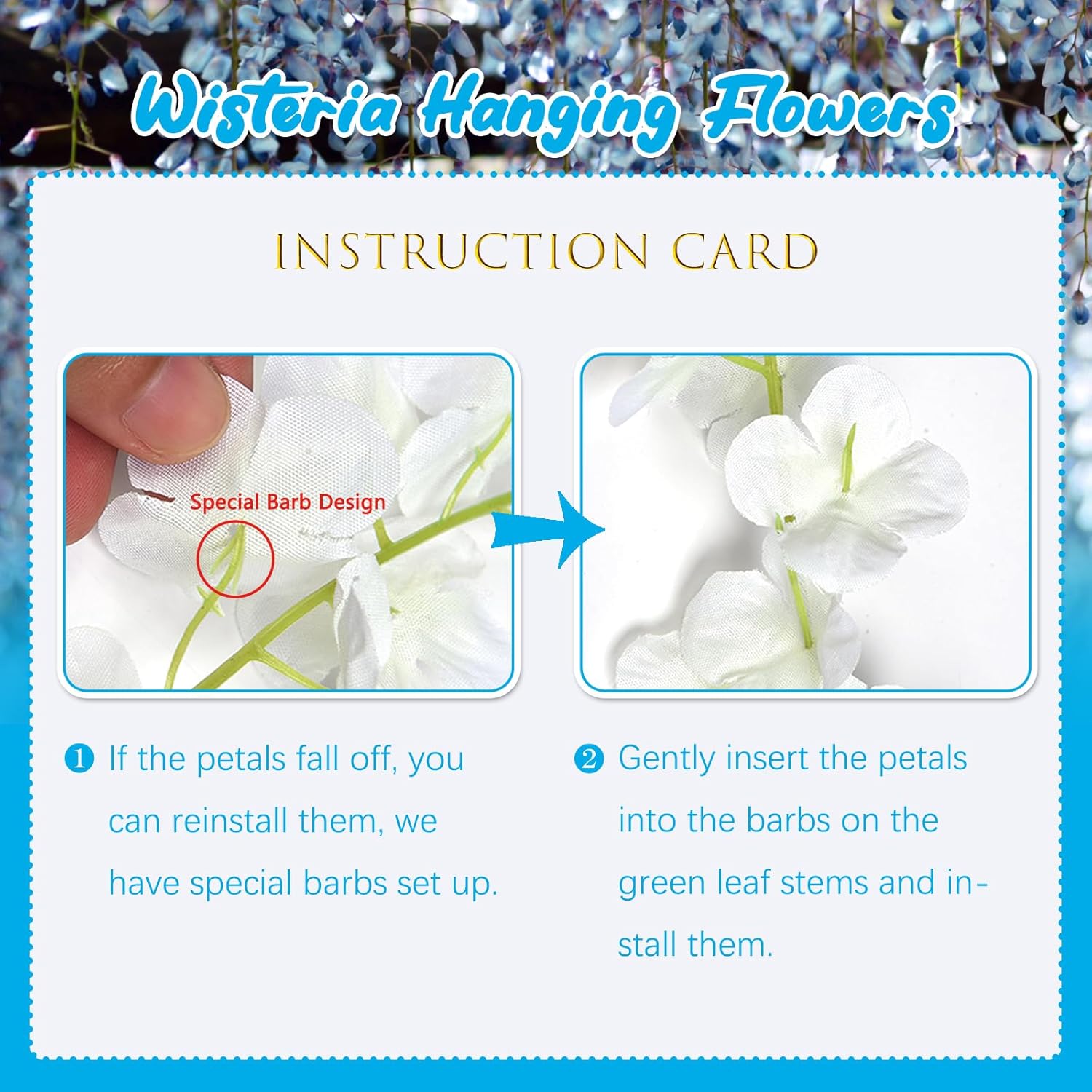 - 【Easy to Install】The blue wisteria flower vines stem are made of durable metal wire and covered with plastic. You can bend the wisteria flower in any shape to satisfy your decoration imagination without damaging it. And the wisteria flower is very easy to install and remove, you can reduce a lot of troubles on installation.