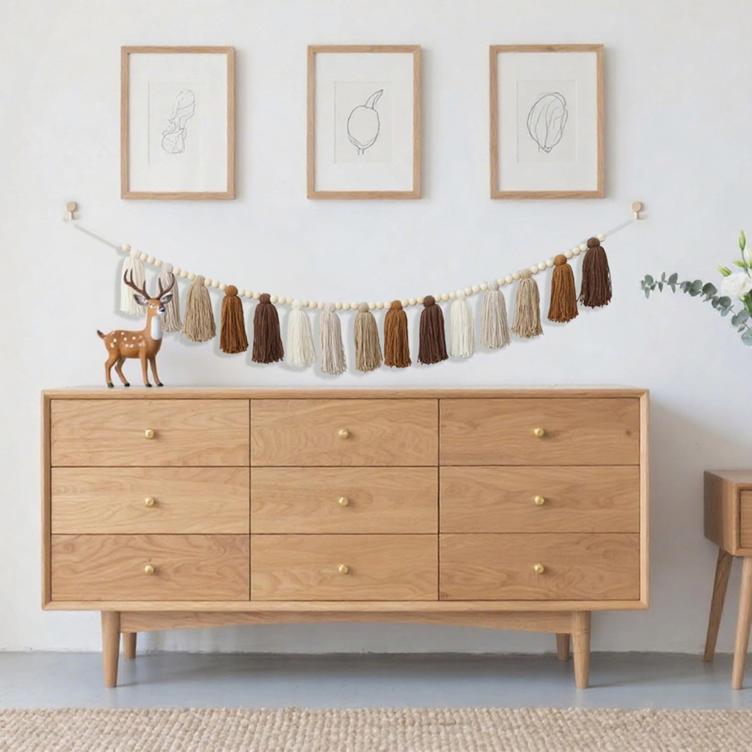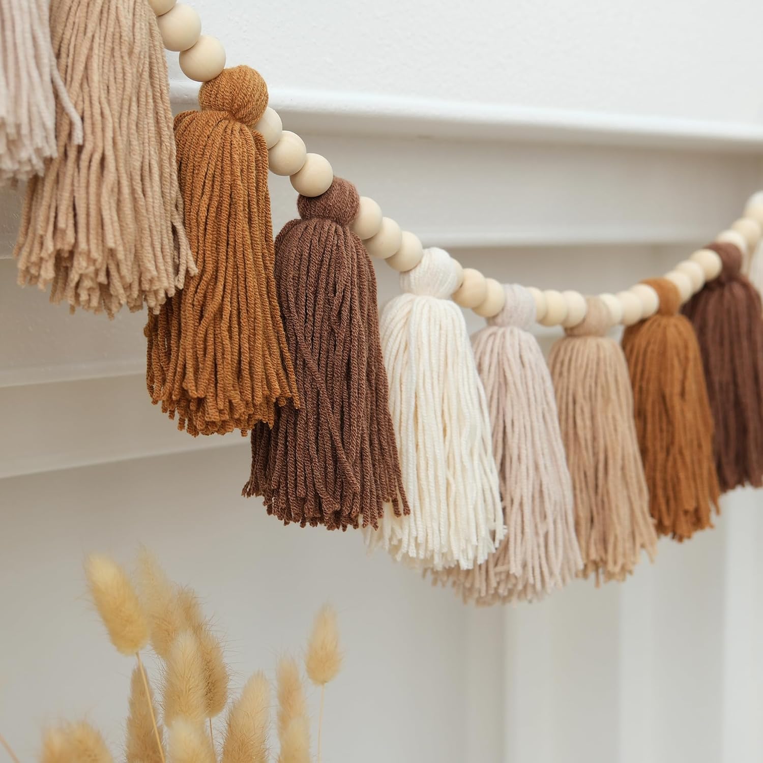 - Packing list: A handmade tassel garland made of yarn tassels and wooden beads in various colors such as terracotta brown; unique bohemian style elements; soft tones; presenting western decorative aesthetics