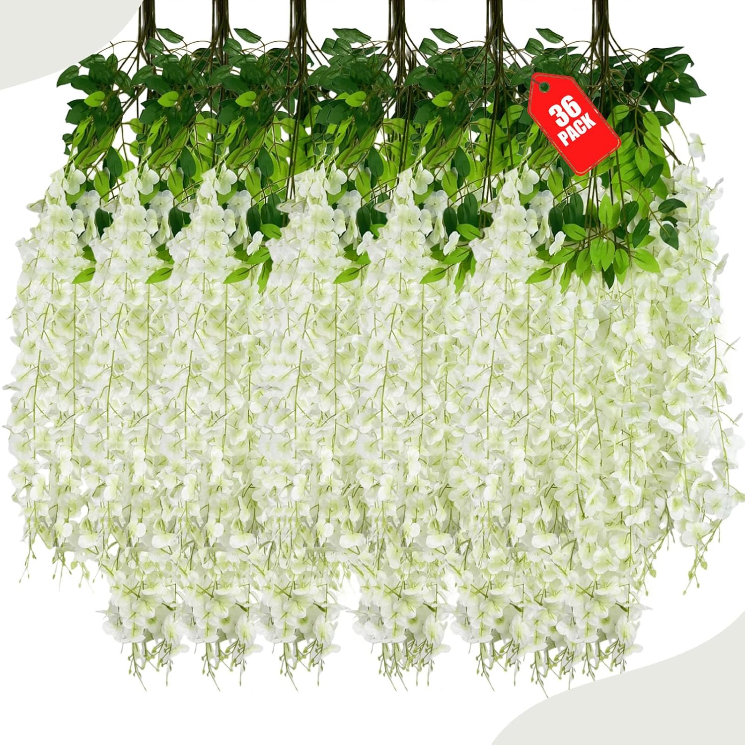 36 Pack Green White Wisteria Hanging Flowers, 3.44 Ft Fake Hanging Flowers, Artificial Wisteria Garland Vines for Wedding Room Backdrop Outdoor Patio Garden Decoration