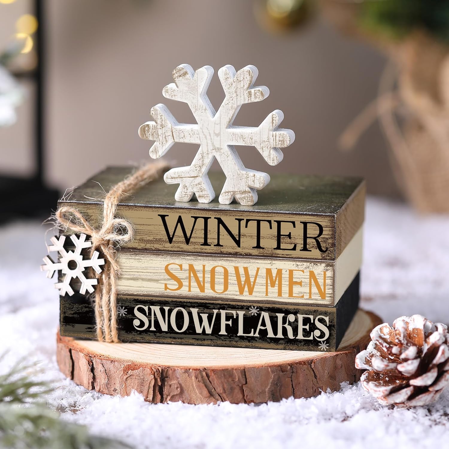 - EXQUISITE DECORATION: The set includes 4 snowflake tiered tray decorations, 3 wooden mini books, a standing wooden decoration and a piece of twine, you can tie them together by yourself and tie them with a pretty bow, they make your desktop look warmer and more beautiful