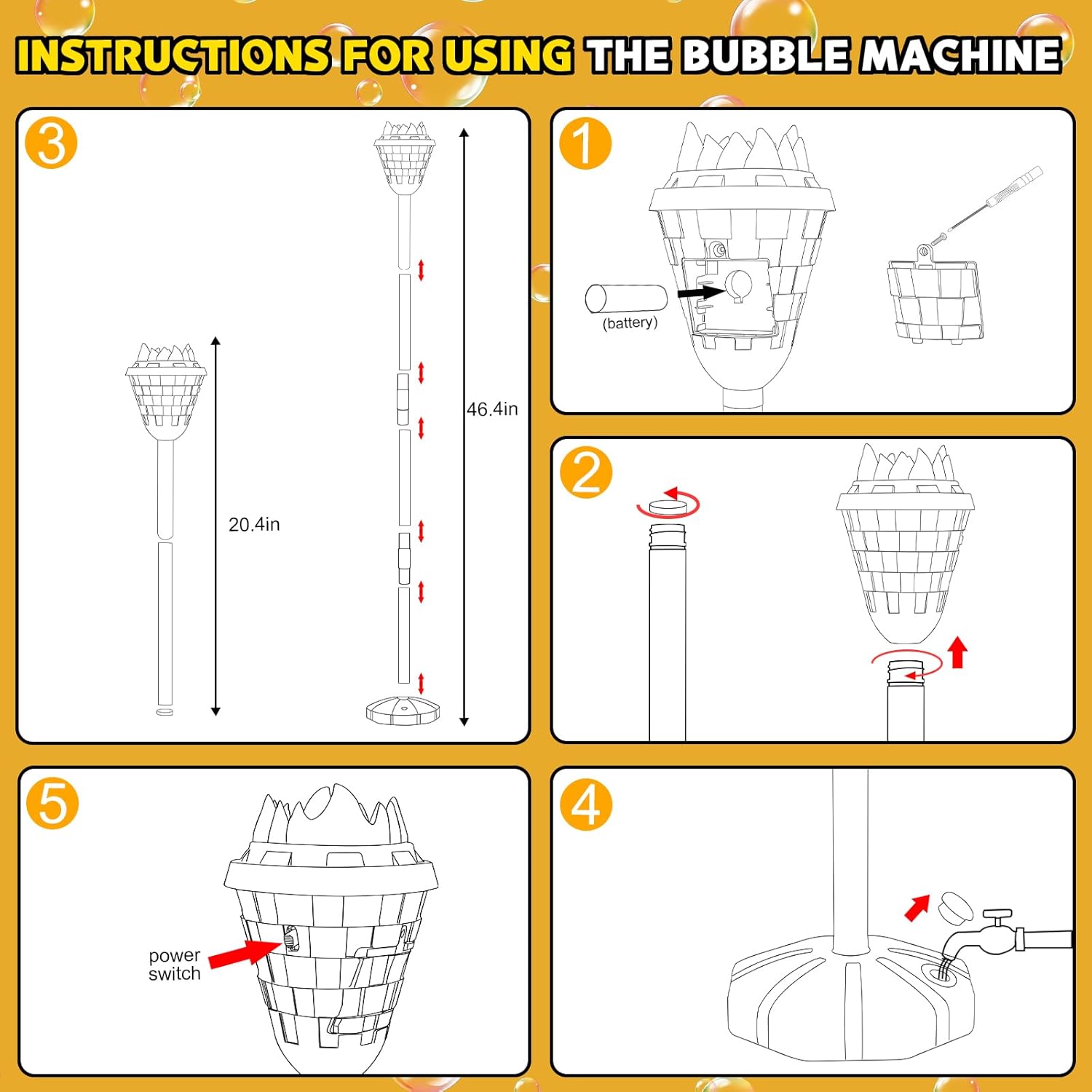 - Easy Assembly & Portable: Our bubble machine has ground stabilizers for stability; simply connect the poles, fill the base with water or sand, and you’re ready to use!Includes 3.7V 1200mah rechargeable battery.The bubble machine toy can work continuously for about 45 minutes.Simply plug them into any USB outlet on your computer, laptop, or in the car, and enjoy the convenience of hassle-free charging.its compact size and mobilizable handle make it easy for kids to carry around.