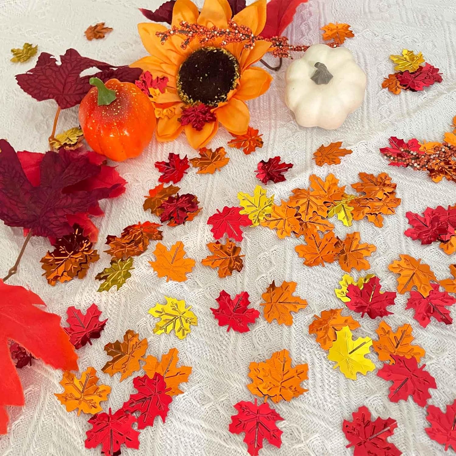 - Widely Used: Autumn leaves confetti are suitable for the decoration of various Thanksgiving parties. Use this maple leaves confetti as something in party invitations, envelopes and candy bags to decorate your party table, cakes, plates, central decorations or scatter on your cake table, so that your guests will like fall confetti for table