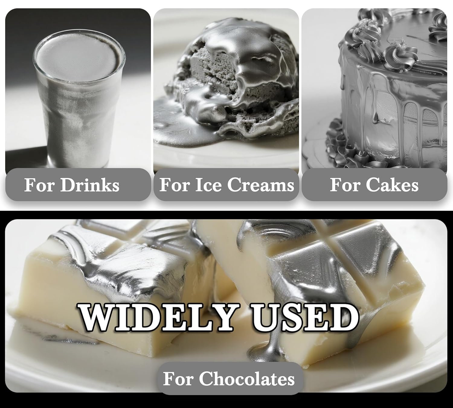 - Brilliant Metallic Effects with Edible Silver Paint: Create stunning high luster finishes on cakes, chocolates, and desserts using our silver food coloring. This edible paint delivers brilliant metallic shimmer without altering taste, perfect for professional bakers and DIY enthusiasts seeking a luxurious touch.