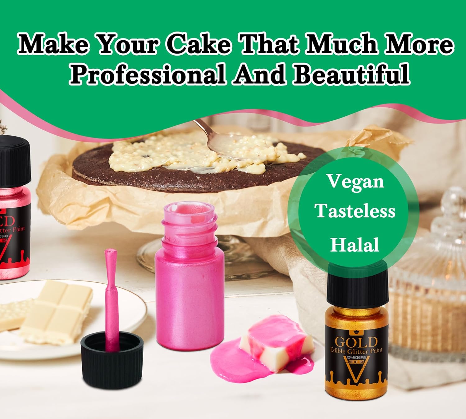 - Food-Safe and Allergen-Free Ingredients: Made from 100% food-grade materials, our edible glitter paint is gluten-free, dairy-free, and vegan. It’s safe for all ages, free from GMOs and allergens, ensuring your decorations remain tasty and healthy.