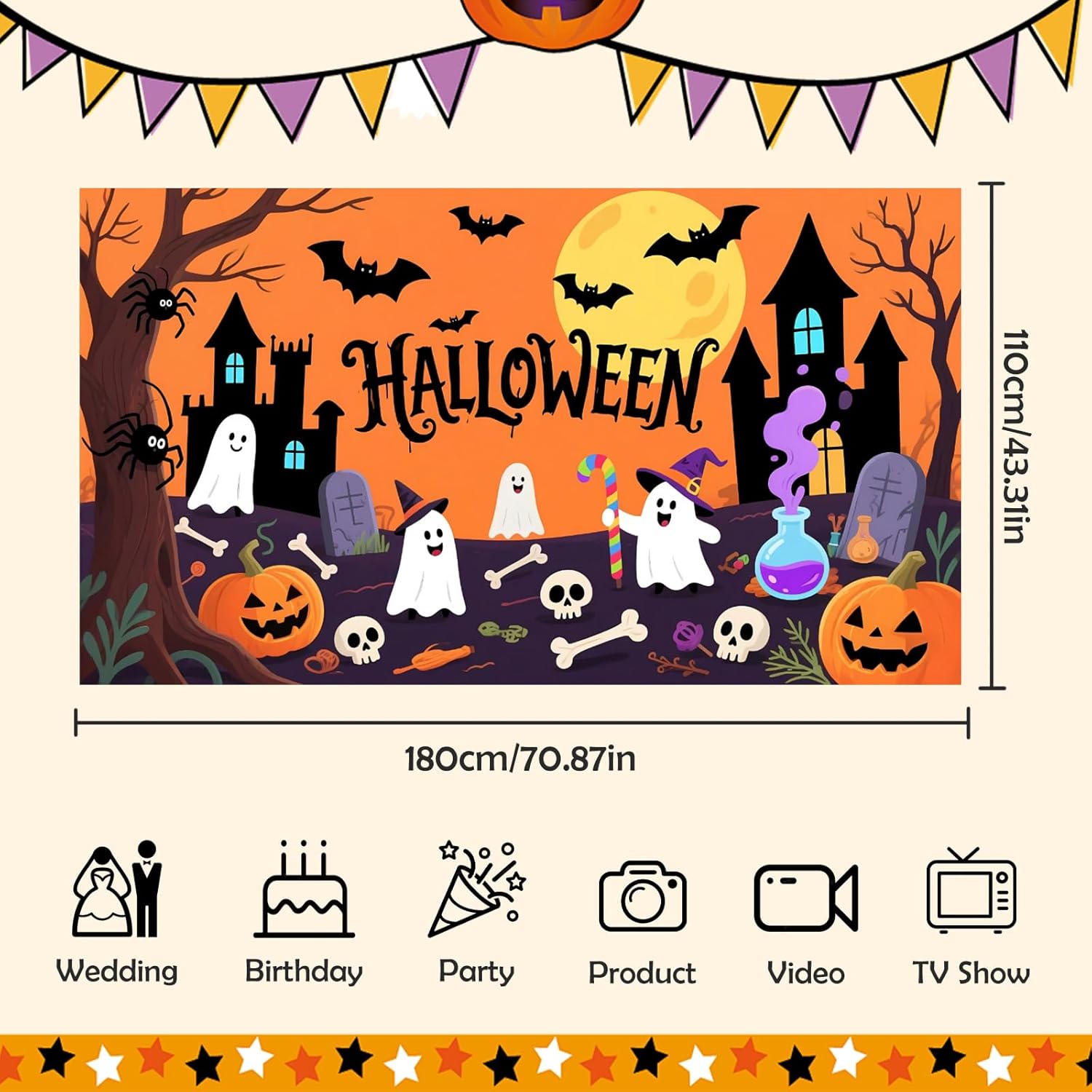 - Halloween Background: 1 pcs, 70.87 x 43.3in (1.1 m x 1.8 m), Premium Vinyl Material, Profession photography cloth ,High-resolution digital print with eye-catching details and lifelike colors.Light absorbing and Non-reflective,clear clarity - the perfect photo prop! Warm Tips:The item will be sent in a folded manner, and slight creases may occur during transportation. Before use, the back can be easily wrinkle free by low-temperature ironing.