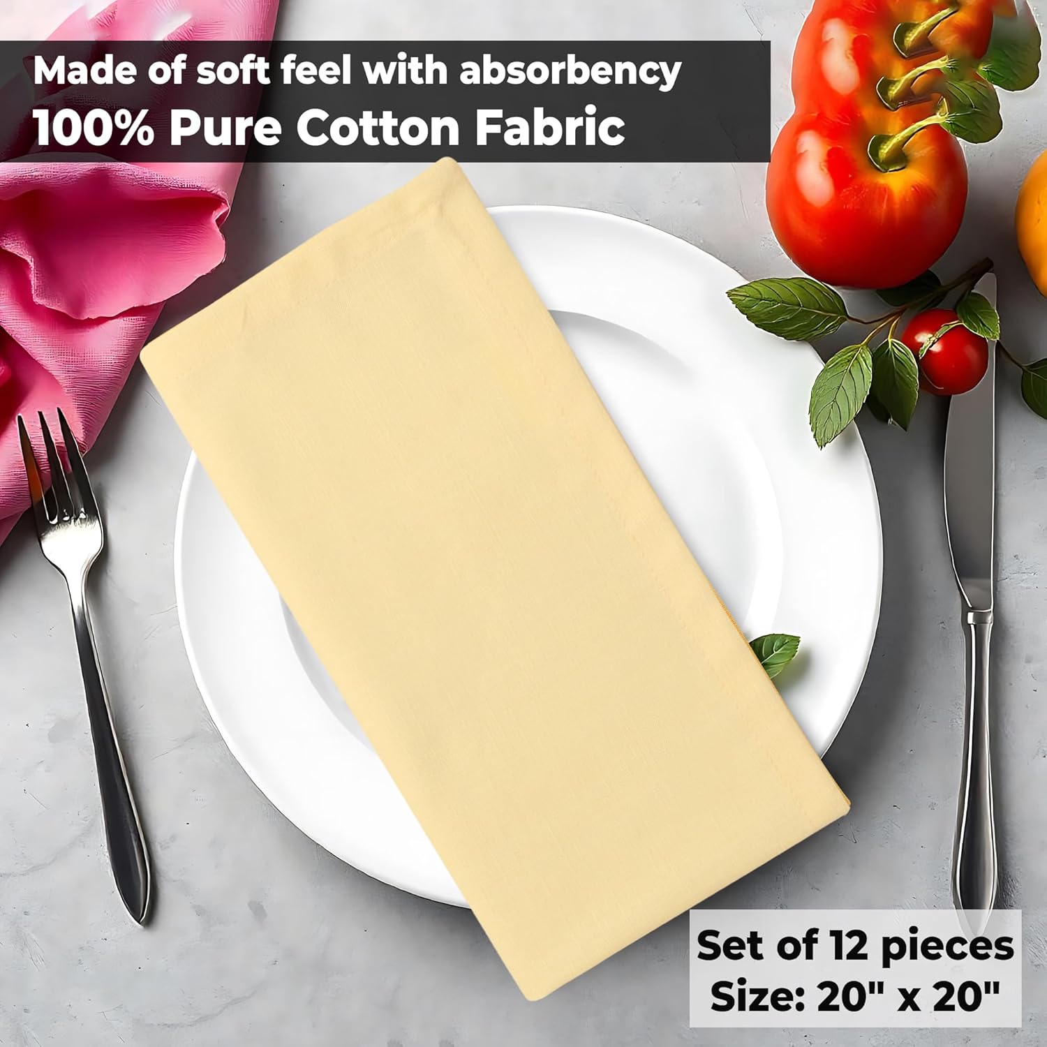 - SOFT COTTON : Made from 100% Premium cotton these Dinner Napkins are skin friendly, Eco friendly and Food Safe at the same time making fashion sustainable. Min shrinkage after wash makes these napkins reusable adding a Great value for money compared to Paper and disposable Napkins