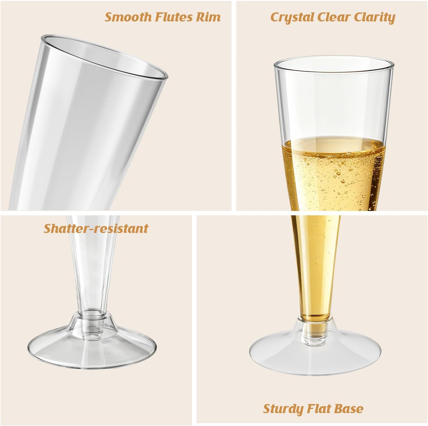 - Elegant Design – Crystal-clear disposable plastic champagne flutes add style to weddings, parties & mimosa bars.