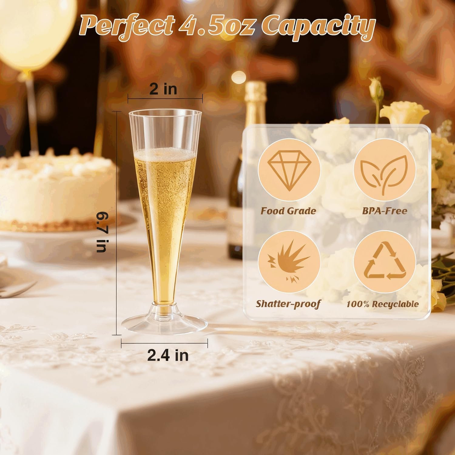 - 100 Pack Value – Includes 100 clear plastic champagne wine glasses (4.5oz), enough for big celebrations.