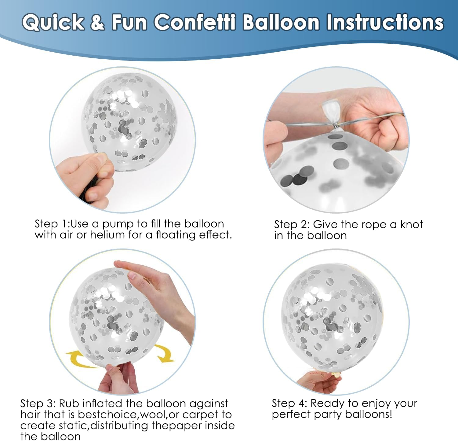 - 【 Confetti Balloon】Due to the blue and silver confetti balloons is heavier than helium, the confetti moves in the direction of gravity. Rubbing the outer side of the balloon on the hair (the best way )or silk, wool, will help the confetti stick to the balloon. A balloon pump is strongly recommended. This will make the balloons look more beautiful.