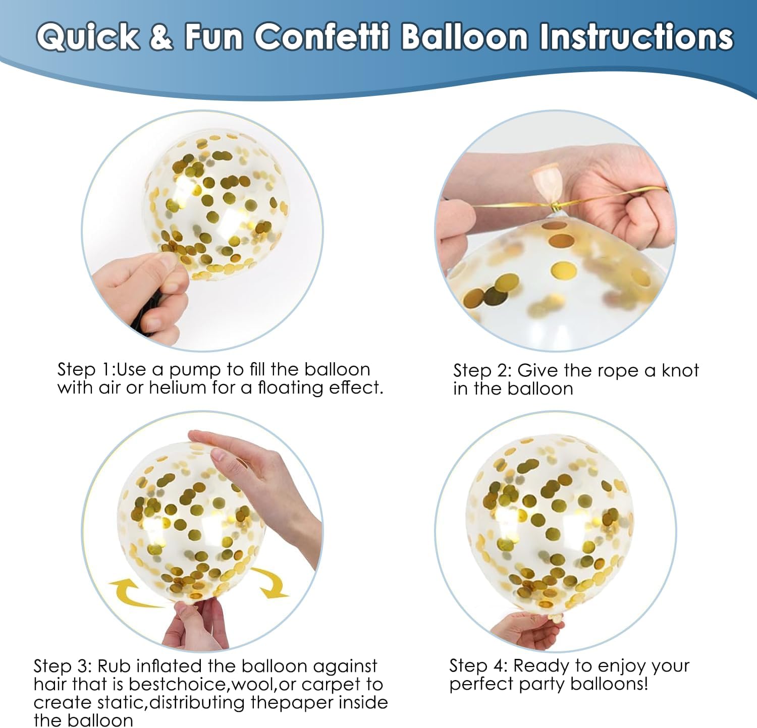 - 【 Confetti Balloon】Due to the gold confetti is heavier than helium, the confetti moves in the direction of gravity. Rubbing the outer side of the balloon on the hair (the best way )or silk, wool, will help the confetti stick to the balloon. A balloon pump is strongly recommended. This will make the balloons look more beautiful.