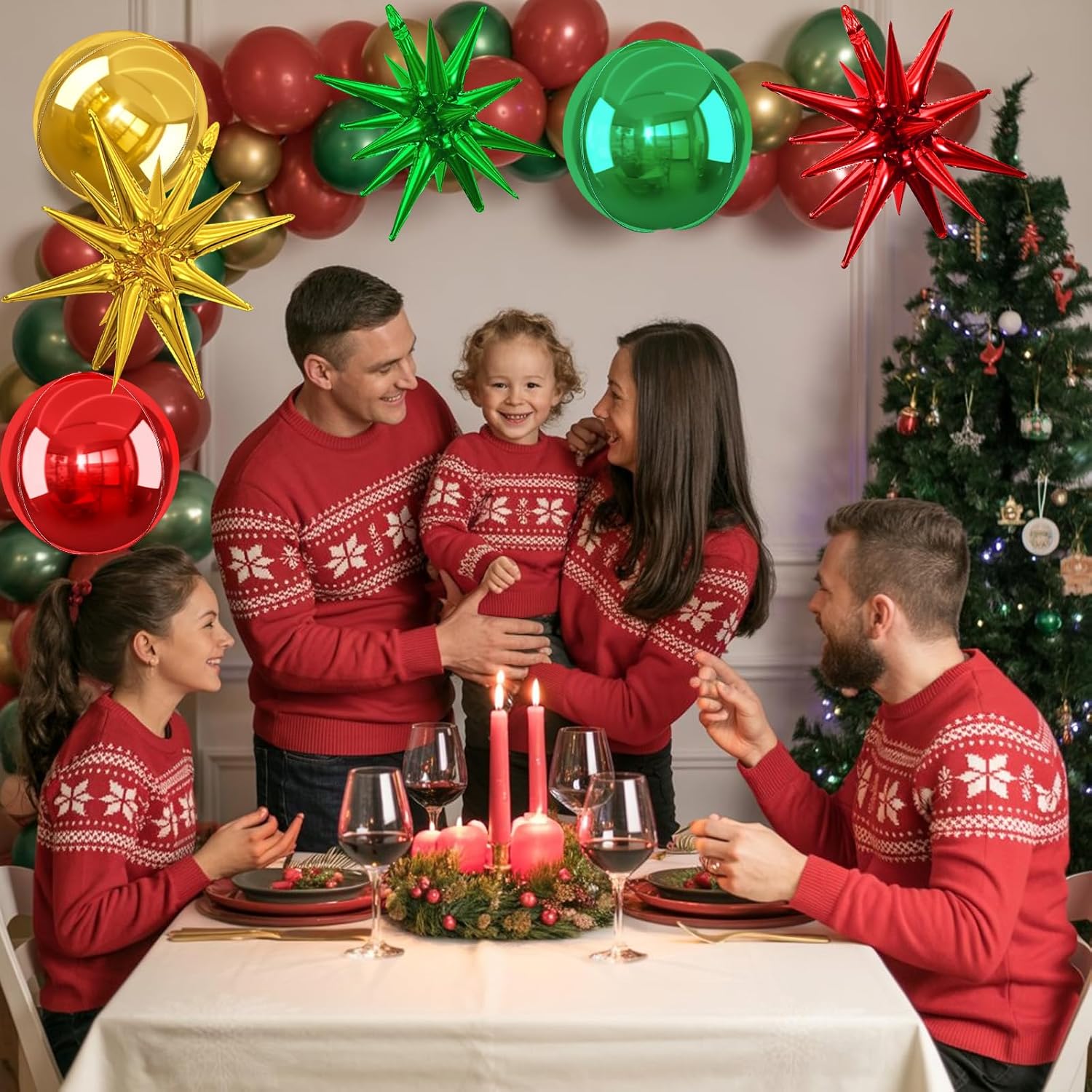 6Pcs Red Green Gold Foil Balloons,22Inch Green Red Gold 4D Round Ball Balloon and Explosion Star Balloon for Christmas Birthday Wedding Baby Shower Anniversary Party Decorations