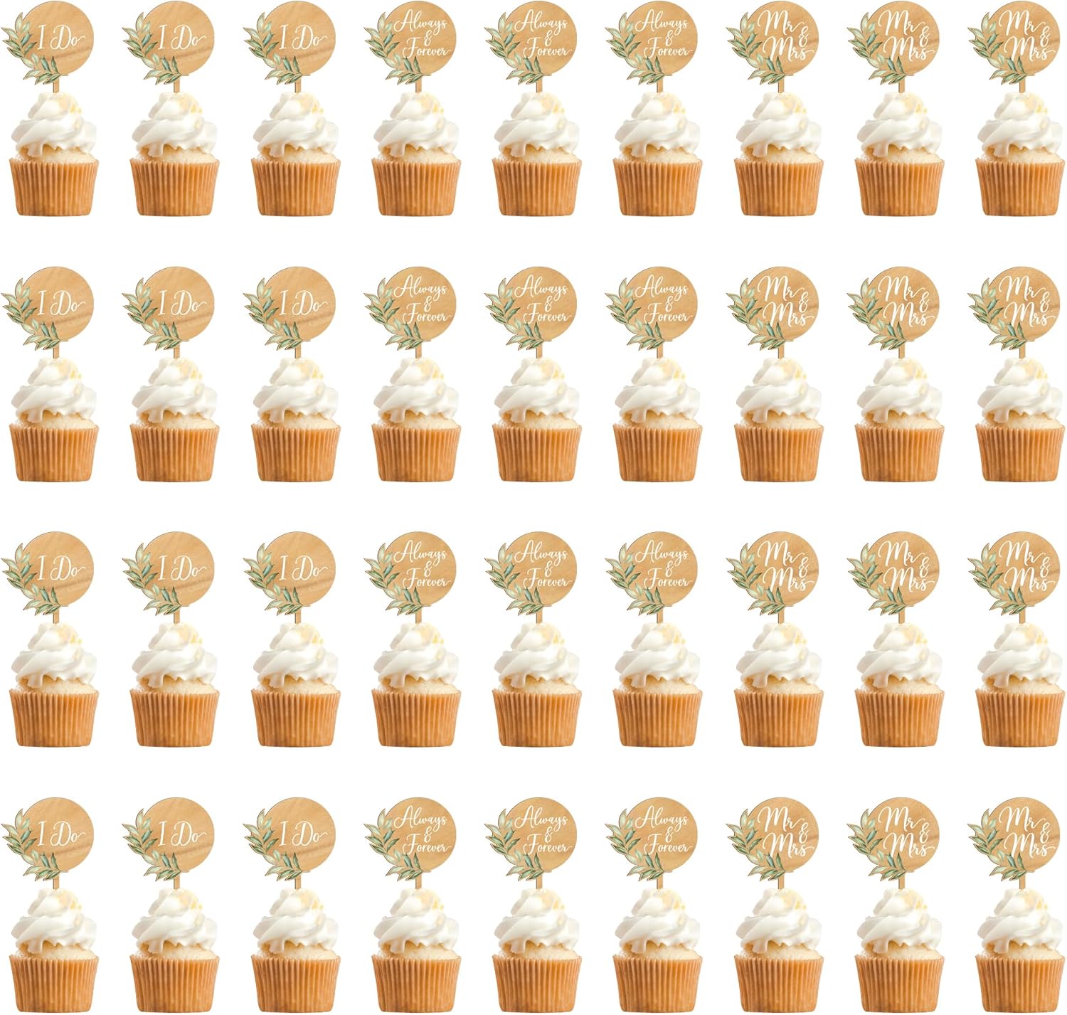 36 PCS Mr & Mrs Wedding Cupcake Toppers with Green Leaves Engagement Cake Decorations