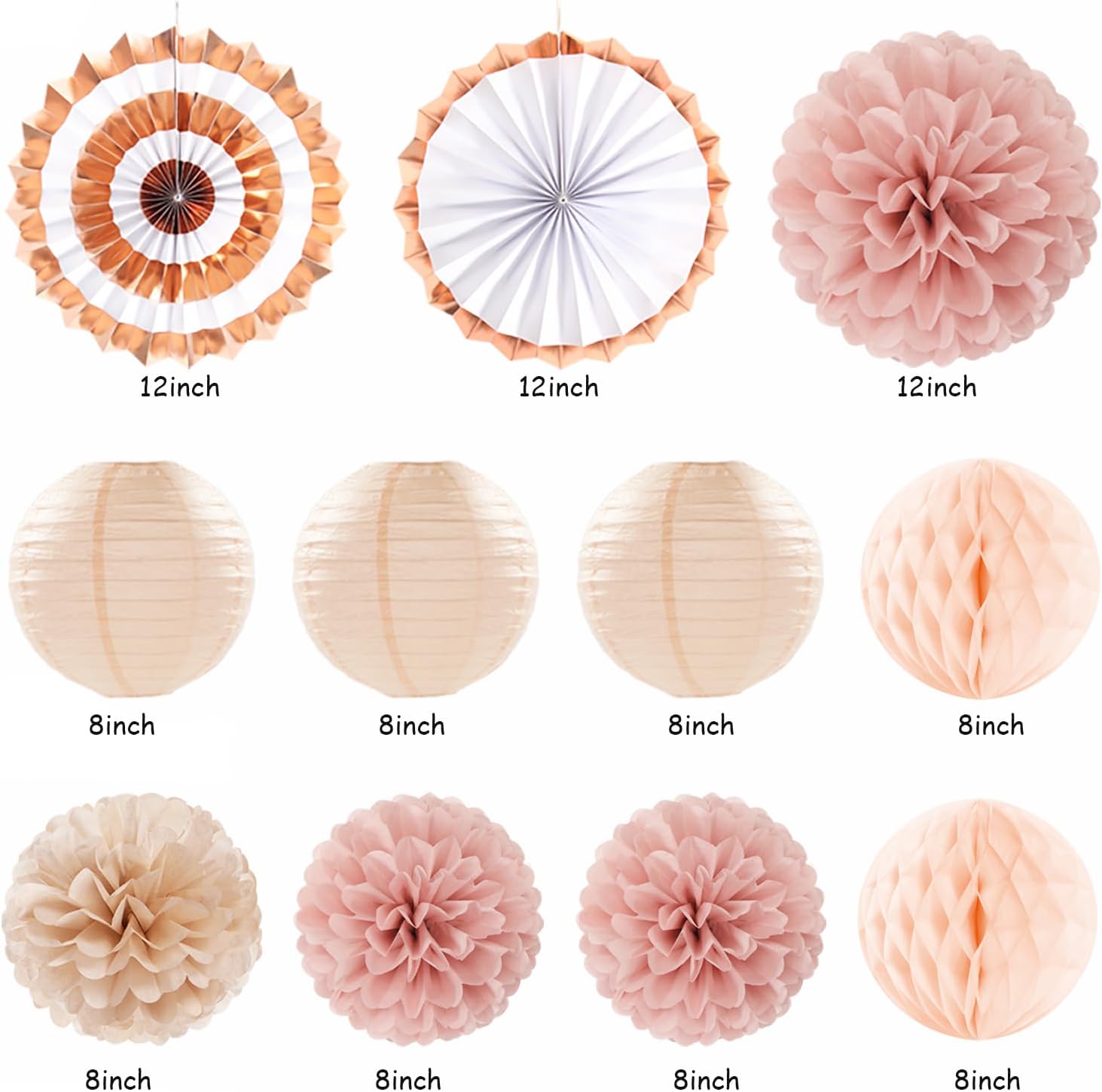 - 【Package Content】 Blush pink rose gold fall birthday party decorations contains: 1 pcs happy birthday streamers garland banner sign, 1 pcs circle dots paper banner, 3 pcs hanging paper lanterns, 4 pcs tissue paper pom poms, 2 pcs honeycomb balls, 4 pcs paper fans, 6 paper swirls, total 21 pcs in 8 12 16 inch and blush pink rose gold peach color.