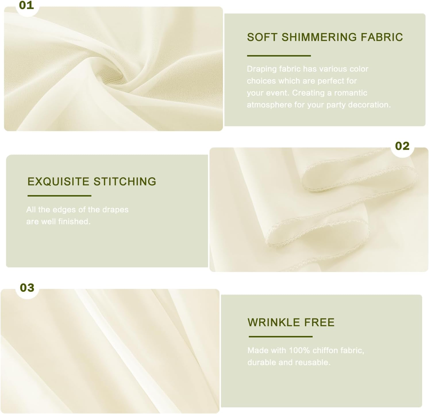 - Romantic Decor: These wedding arch drapes are good choice for any size of Arch, Canopy, Chuppah, Arbor or Altars. Also, you can hung flowers, ribbons, strings of pearls on these arch draping to decor your weeding or party more elegant.