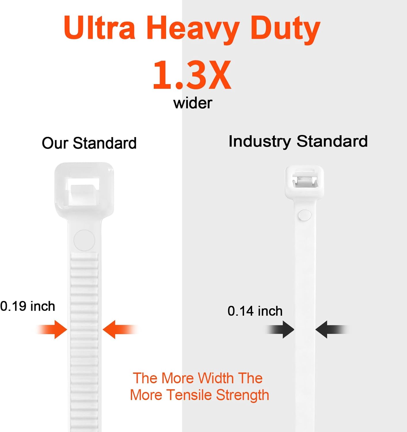 - 【60lb Tensile Strength】: The more width and Thickness, the more tensile strength. our zip ties 26 inch width is 0.19 inch(4.8mm), while industry standard is 0.14 inch(3.6mm), our zip ties 26 inch Thickness is 0.065" inch(1.65 mm), while industry standard is 0.05 inch(1.25mm),more tensile strength.