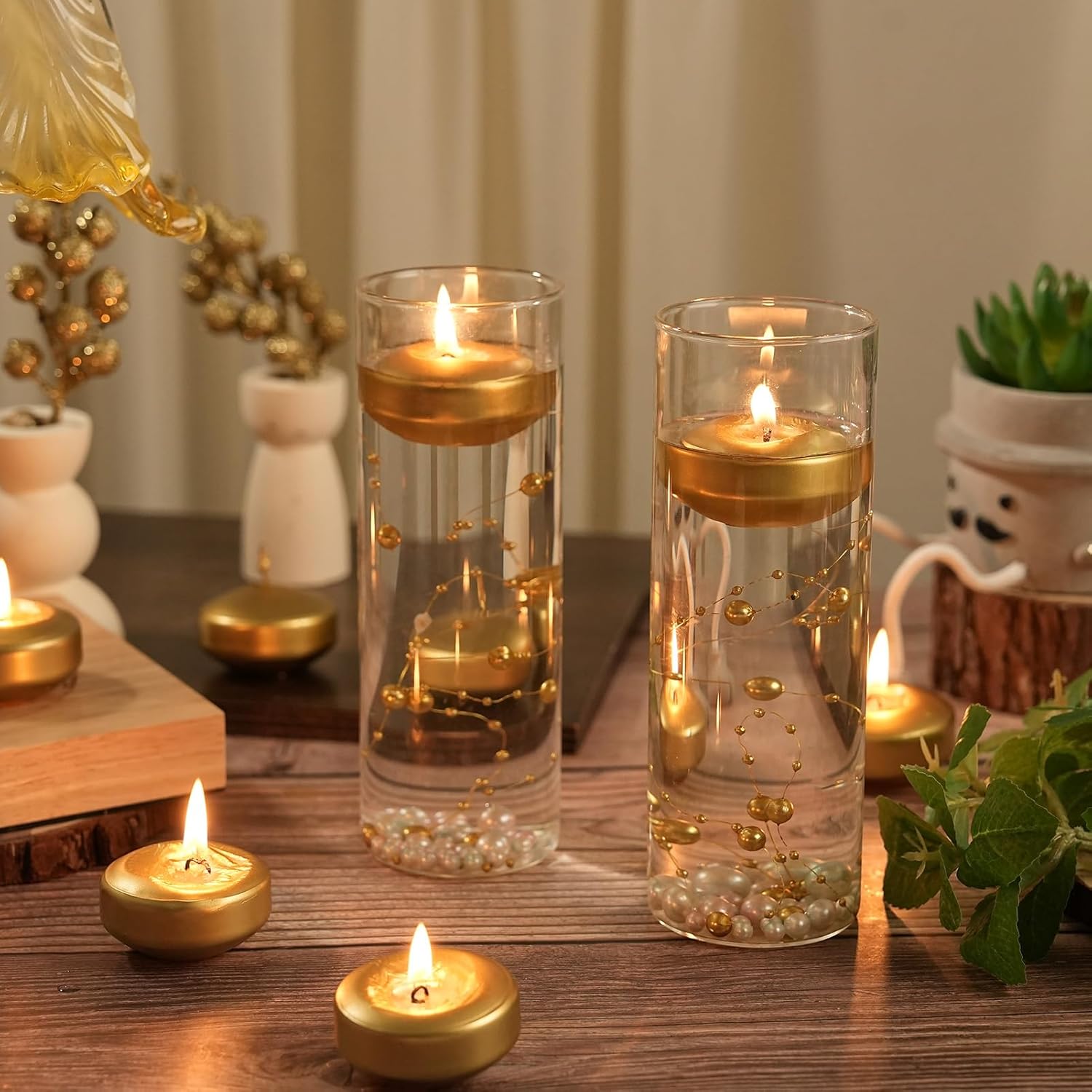 - Unique Lightweight Design Gold Floating Candles:The specially formulated lightweight wax allows these candles to float effortlessly.Place them in a bowl of water,a serene swimming pool,or a water-filled vase to create a captivating centerpiece that sparks joy and conversation
