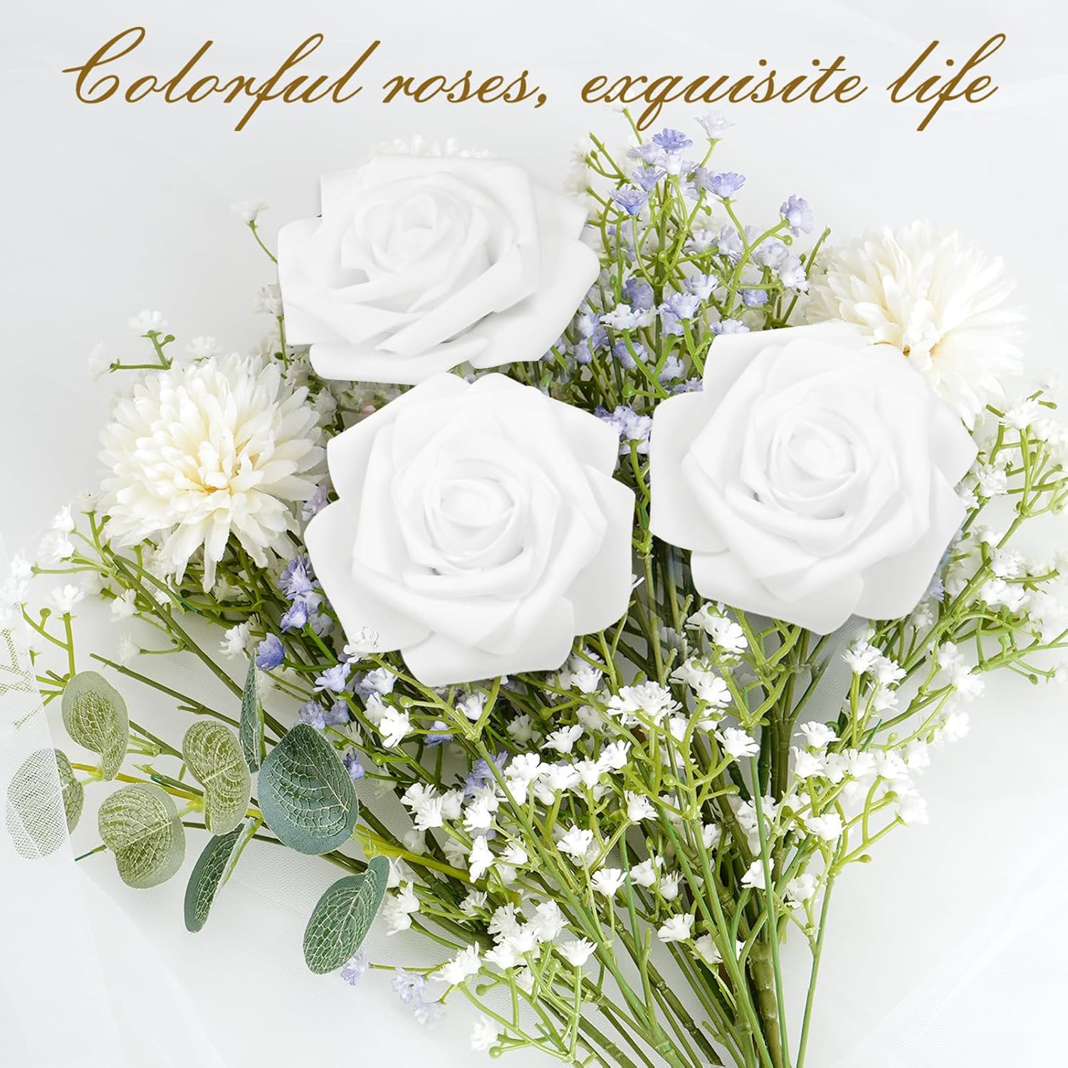 BLEUM CADE 36Pcs Artificial Flowers Fake Roses with Stems, White Boxed Foam Roses for DIY Bouquets Centerpieces Wedding Party Arrangement Bridal Shower Decor