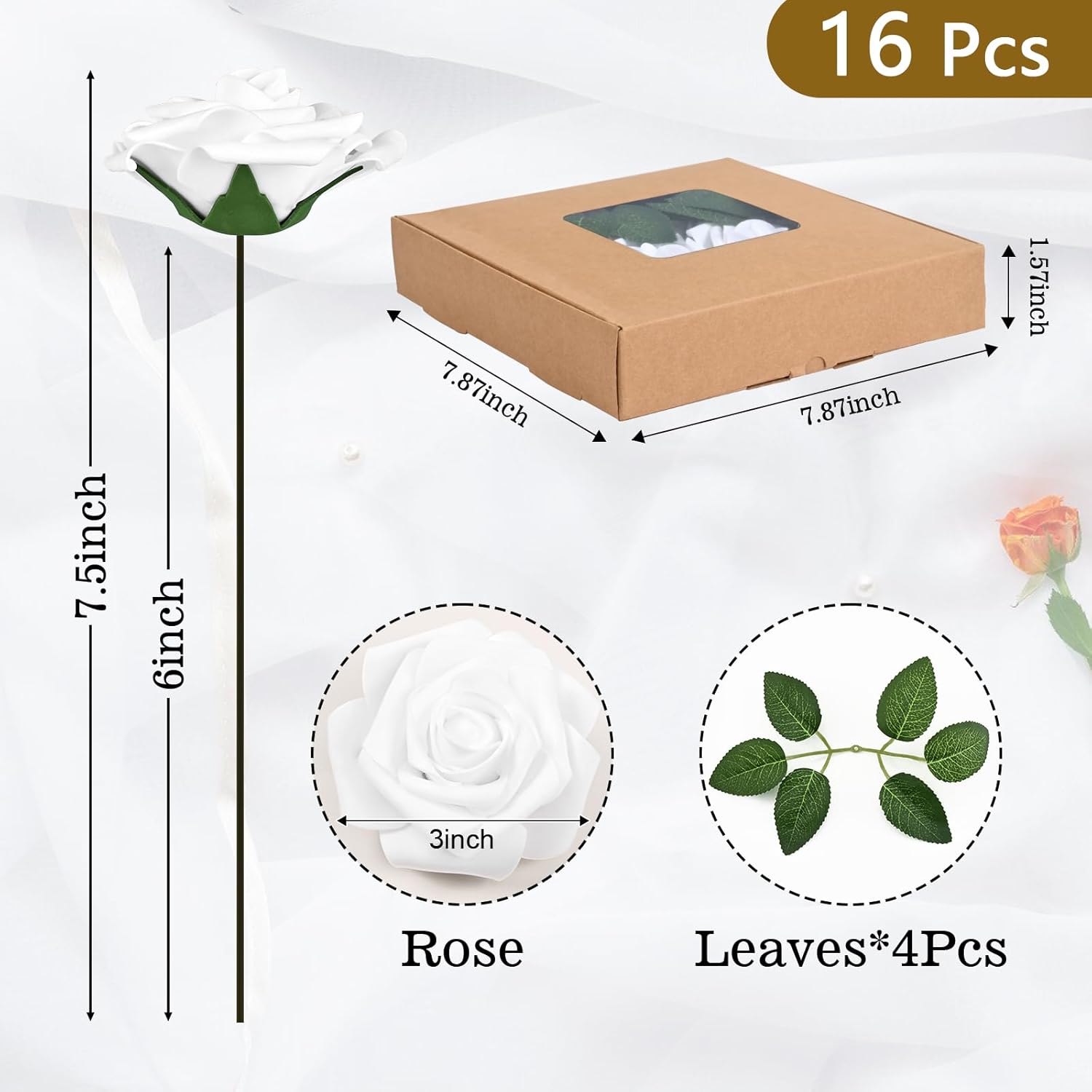 - Kindle Your Creative Flames: The box includes 16 white roses (3" flower head, 8" stem) and 4 green rose leaves, perfect for an array of DIY crafts. Whether creating wedding bouquets, graduation or birthday party ornaments, baby shower decorations, or cake adornments, our faux roses add a touch of class to every important moment.