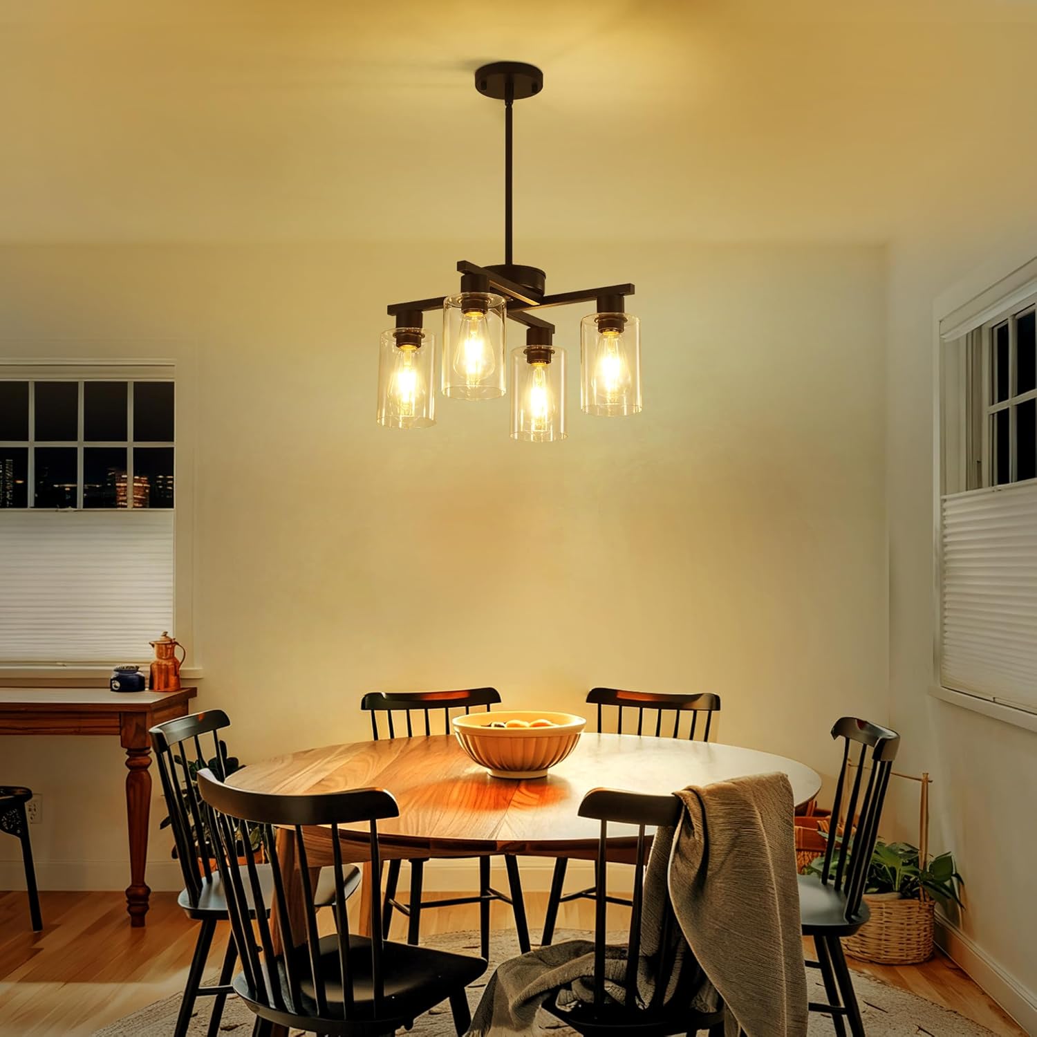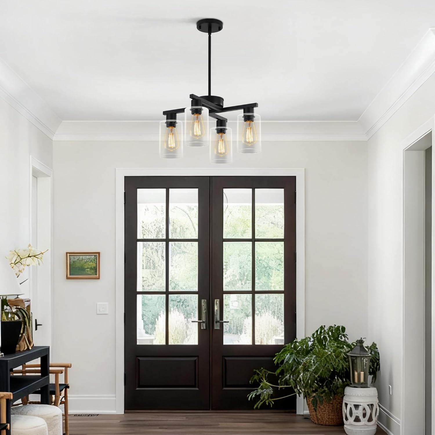 - 【Unique Contemporary Design】This black chandelier has 2 elegant “Y” shaped arms that reach out from the center in a distinctive interlocking shape, paired with 4 cylindrical glass shades to create a striking geometric silhouette. The modern glass chandelier body is crafted from high quality metal with a matte finish for a premium and classy texture. The transparent glass shades are like a light veil, gently wrapping the light and scattering it softly. The shades and the metal body reflect each other, perfectly blending the ruggedness of the industrial style with the sophistication of the glass, highlighting the unique style.