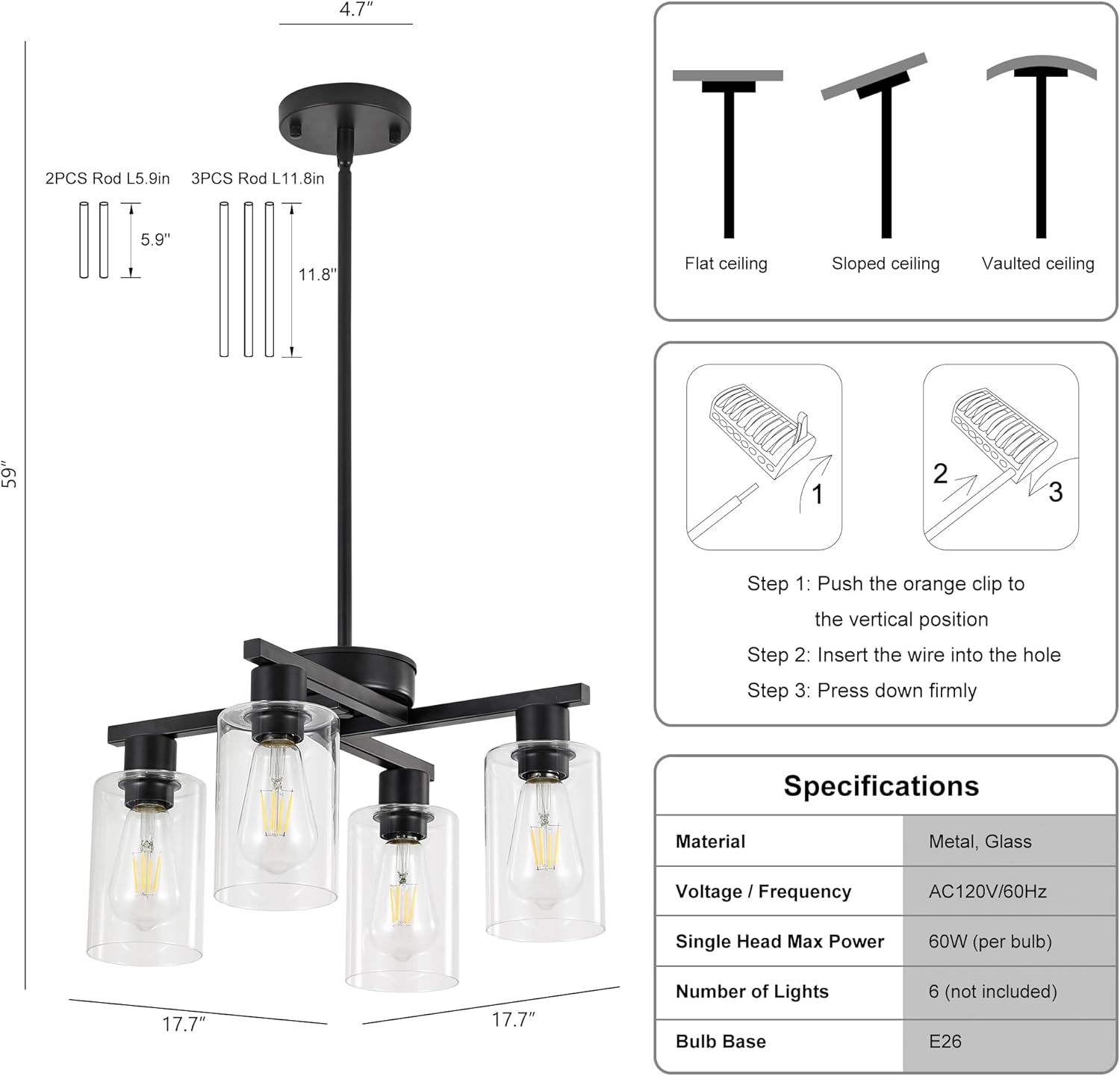 - 【Adjustable Hanging Height】Our modern 4-light chandelier for the dining room offers flexible height adjustment, ranging from 16.7 inches (minimum) to 58 inches (maximum), thanks to its reliable suspension system. The kit includes two 5.9-inch and three 11.8-inch extension rods, with a 4.7-inch diameter canopy. Designed with spliced rods (instead of chains), it ensures enhanced stability and reduces shaking. Compatible with both sloped and flat ceilings, you can easily adjust the hanging height to suit spaces like dining tables, kitchen islands, foyers, or entryways, achieving perfect placement and balanced lighting.