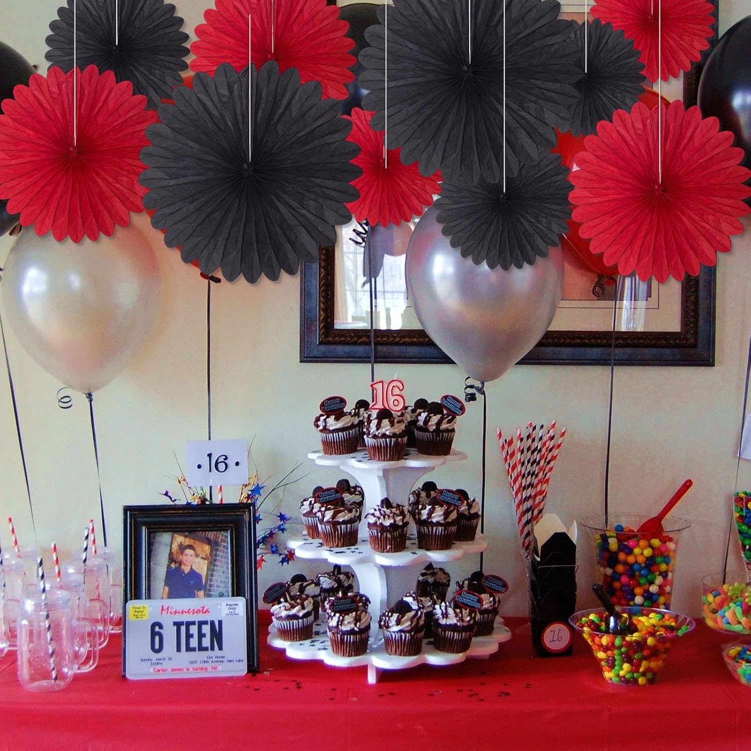 20 Pcs Black Red Hanging Paper Fan, Round Paper Fans Decorations Set for Weddings, Birthdays, Engagement, Bridal Shower, Bachelorette Party Supplies Decor