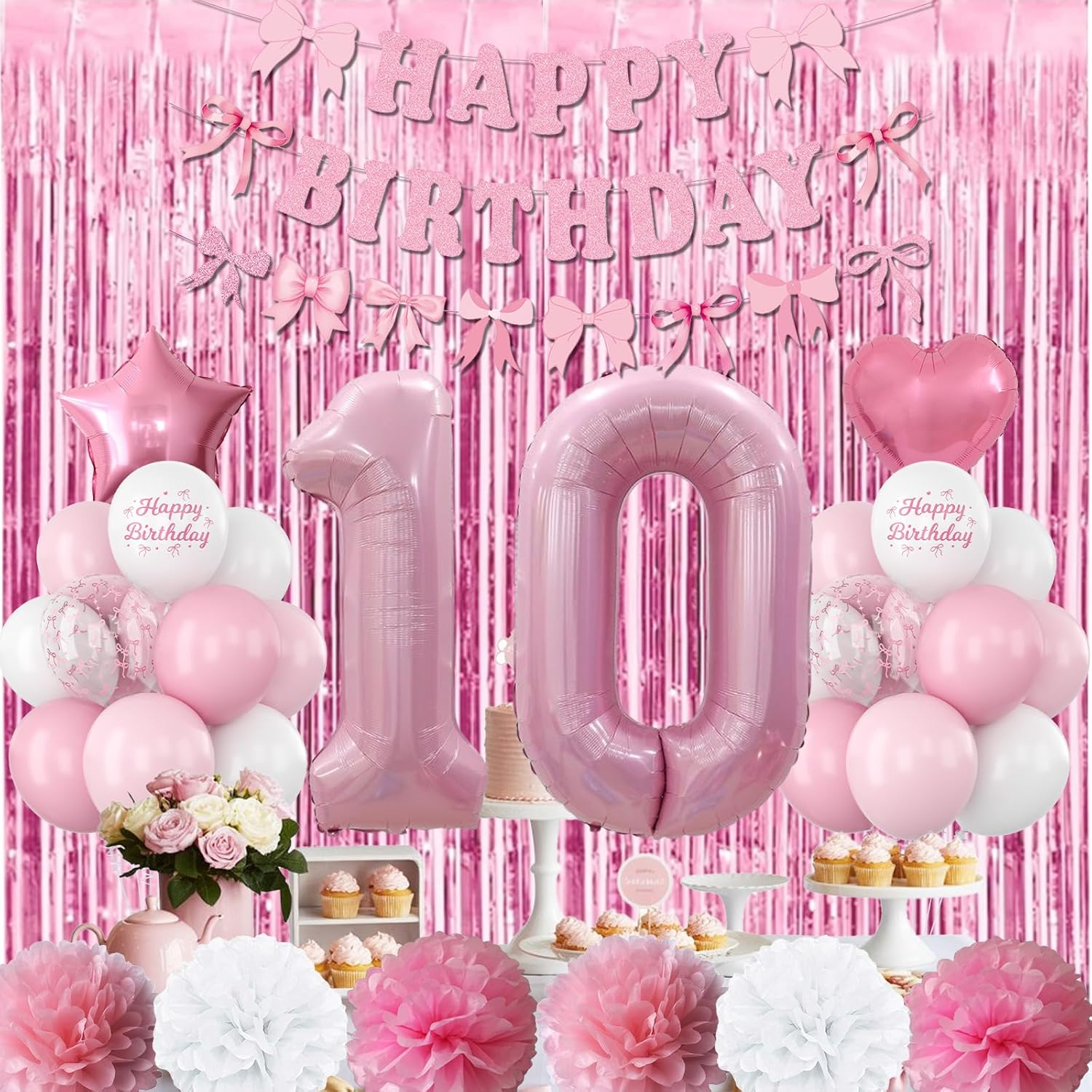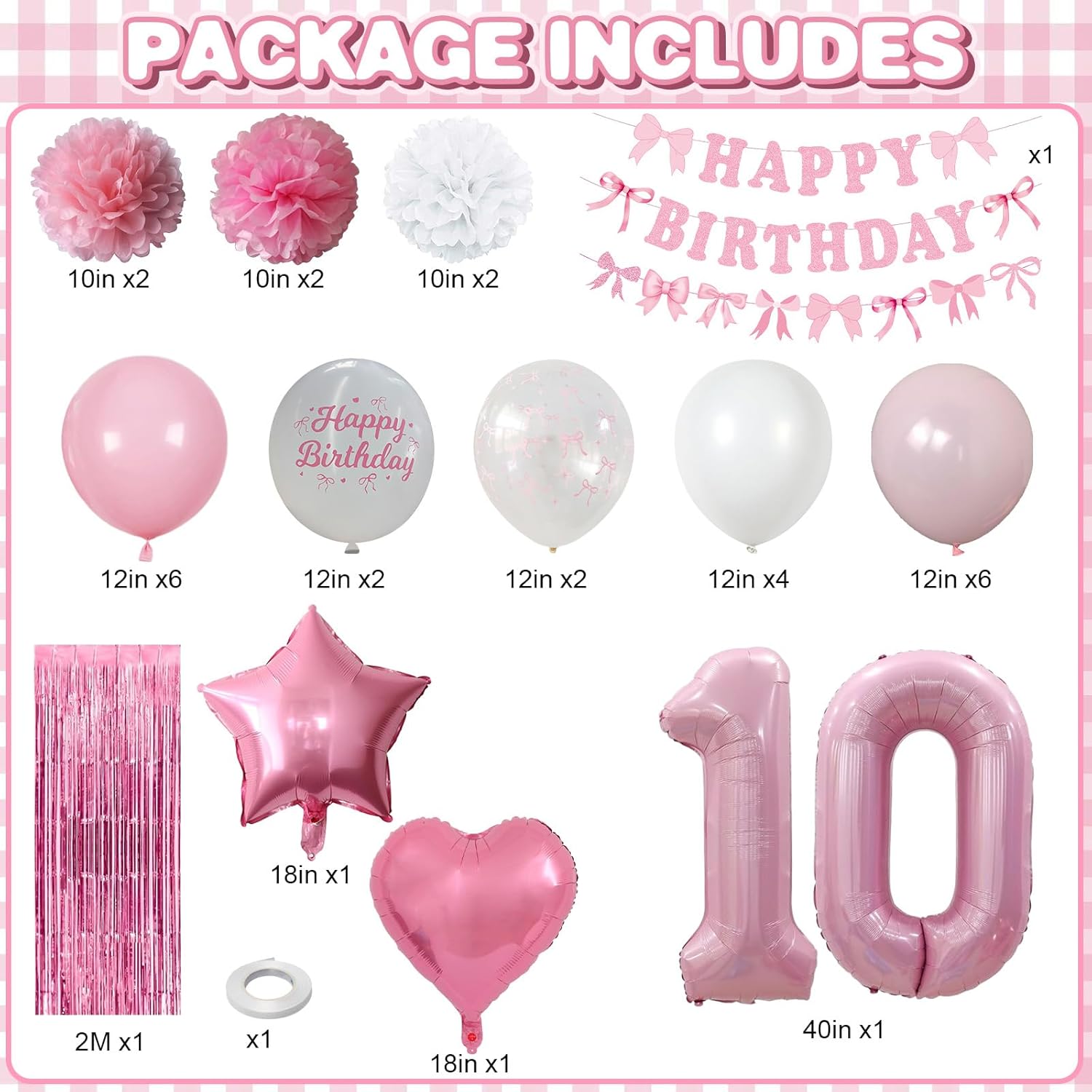- PACKAGE INCLUDES: 1pc pearl pink number 10 balloon, 1pc bow happy birthday banner, 2pcs pink paper pom poms, 2pcs light pink paper pom poms, 2pcs white paper pom poms, 1pc pink curtain, 1pc light pink star foil balloons, 1pc light pink heart foil balloons,6pcs light pink balloons, 6pcs pastel pink balloons, 4pcs white balloons, 2pcs birthday printed balloons, 2pcs bow clear balloons, 1pc ribbon