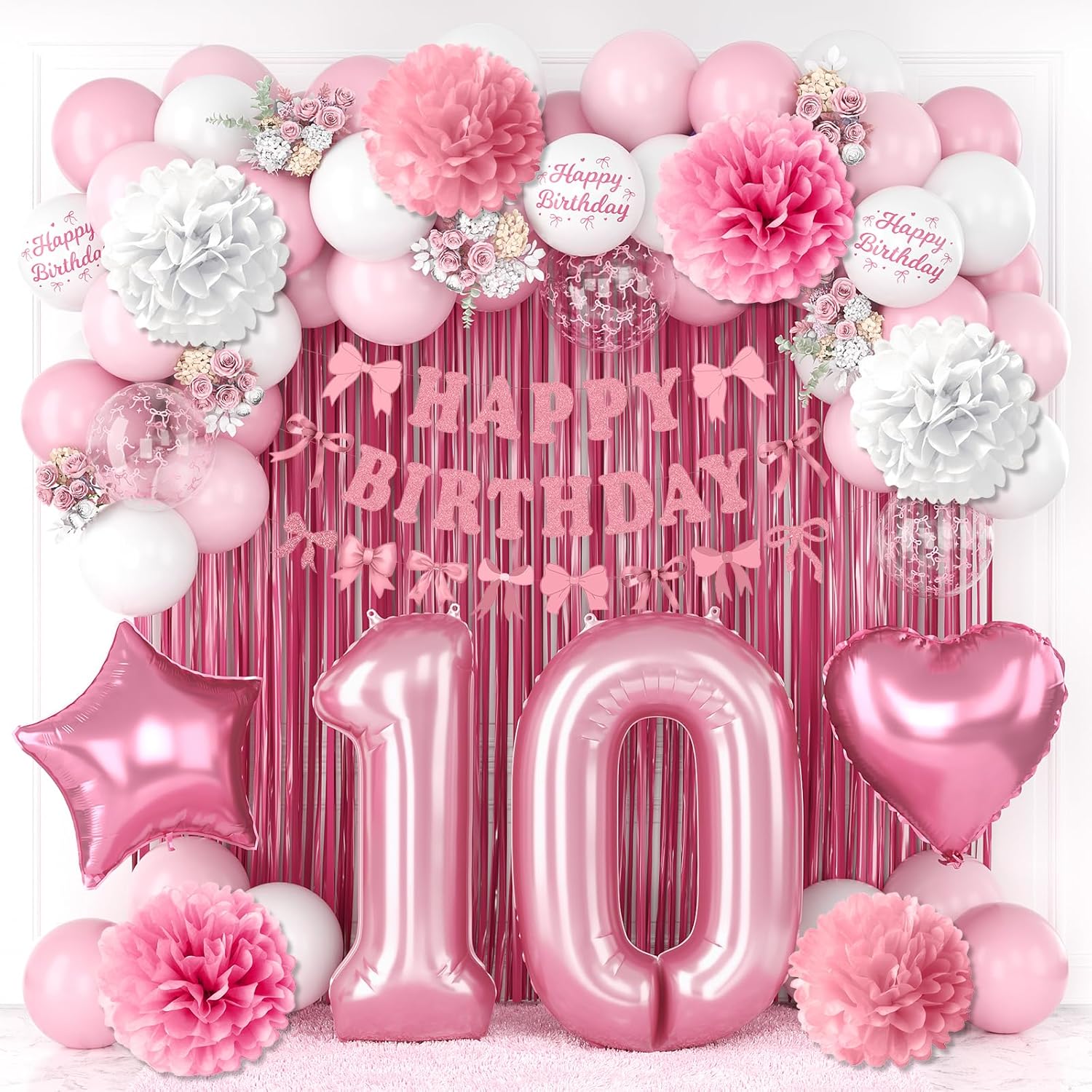 - ALL-IN-ONE DECORATION: Includes pearl pink number 10 balloon, bow “Happy Birthday” banner, pom poms, fringe curtain, foil balloons, latex balloons, special printed balloons, and ribbon – a complete set to decorate your party easily; designed especially for girls turning ten, this decoration set is ideal for birthday parties, home celebrations, and photography scenes, making the day extra memorable