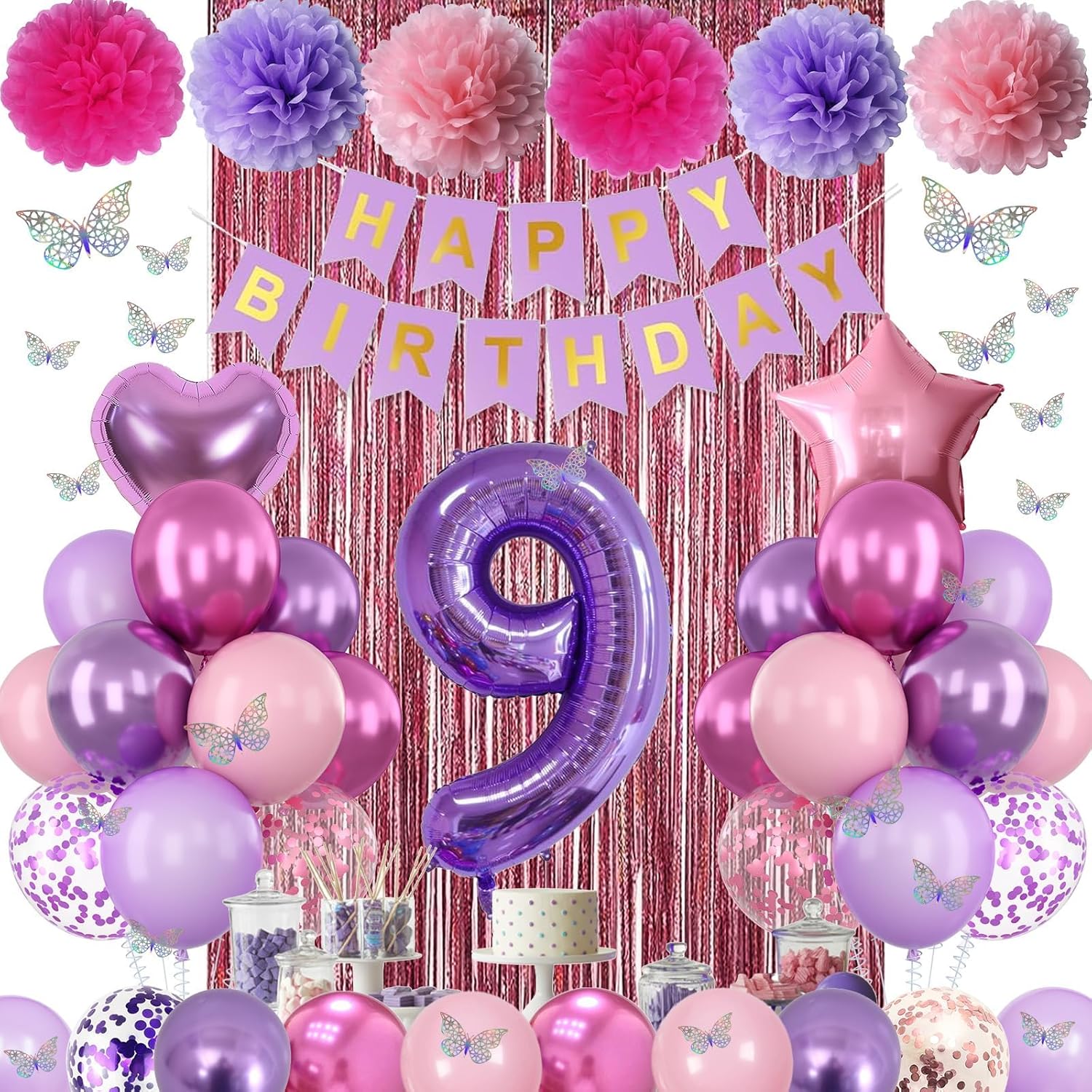 - PACKAGE INCLUDES: 1pc purple number 9 balloon, 1pc happy birthday banner, 2pcs light pink paper pom poms, 2pcs light purple paper pom poms, 2pcs hot pink paper pom poms, 1pc light pink fringe curtain, 1pc light pink star foil balloons, 1pc light purple heart foil balloons, 6pcs pastel purple balloons, 6pcs pastel pink balloons, 4pcs metallic purple balloons, 4pcs metallic magenta balloons, 3pcs purple confetti ballons, 3pcs pink confetti ballons, 1pc butterfly stickers set, 1pc ribbon