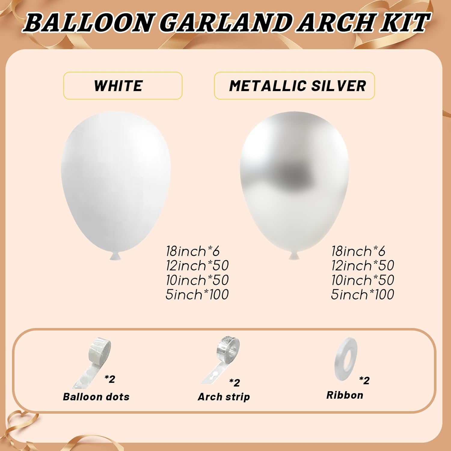 - Package List : white and silver balloon garland kit includes 18" White/Metallic silver balloons(12 pcs), 12" White/Metallic silver balloons(100 pcs), 10"White/Metallic silver balloons(100 pcs), 5" White/Metallic silver balloons(100pcs),glue dotsx200, ribbonx2, decorative stripx2. plenty in quantity.