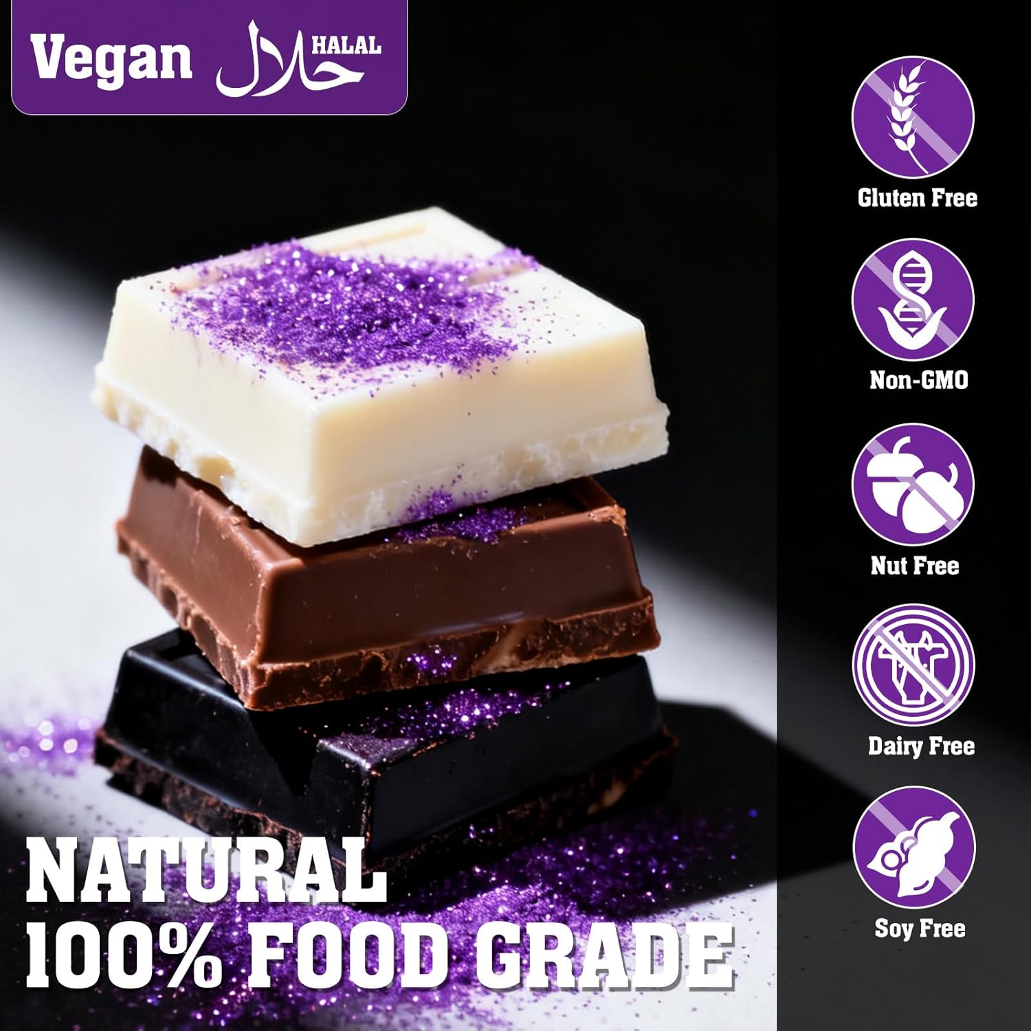 - 【Easy to Use & Versatile】: The edible glitter can simply apply dry with a brush, or mix with alcohol, lemon extract or oil-based flavorings for spray or brush application, or even mix into beverages. These edible luster dust is perfect for decorating frosting, fondant, whipped cream, cocktails, mocktails, champagne, and chocolates with a stunning purple shimmer effect.