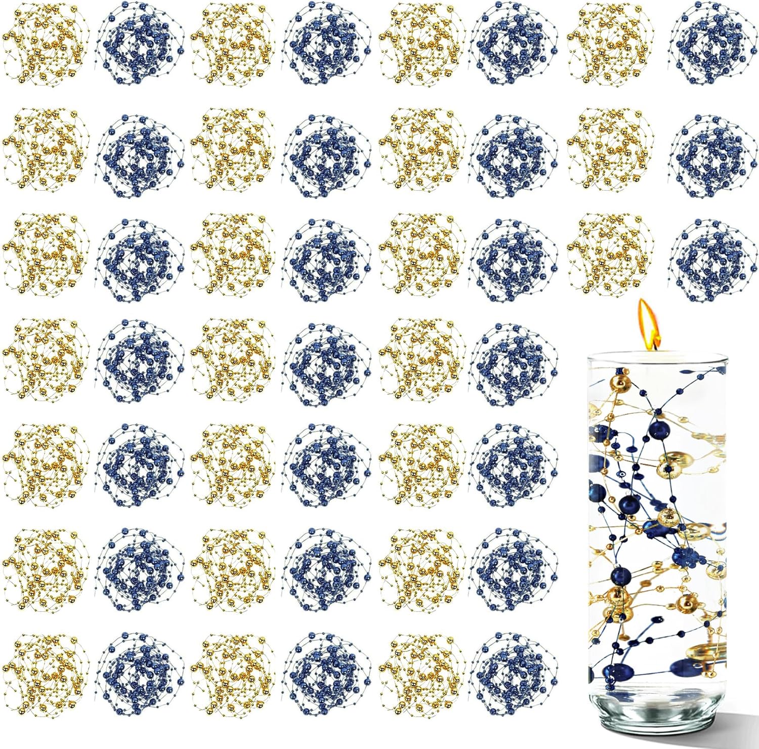 50 PCS Artificial Floating Beads for Centerpieces & Vase Fillers - Navy Blue&Gold 8+3mm String Beads, Faux Pearl Strings for Wedding, Party, Crafts, and Home Decoration