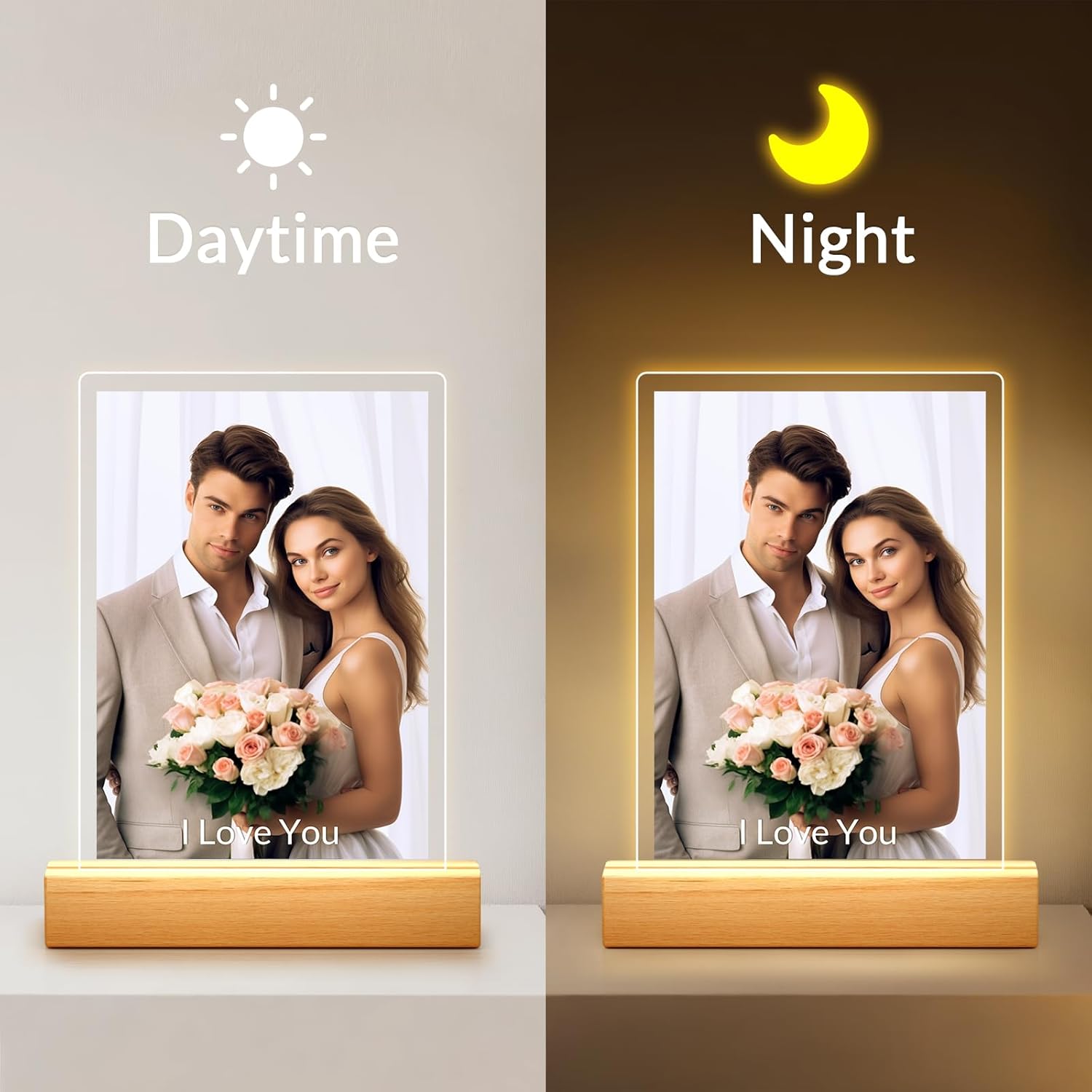 - Personalized Photo Frame with Night Light: Simply upload your favorite photos and add custom text to create a unique acrylic photo plaque with an integrated night light. This artistic display beautifully showcases your precious memories, adding a touch of romance and meaning to any space.