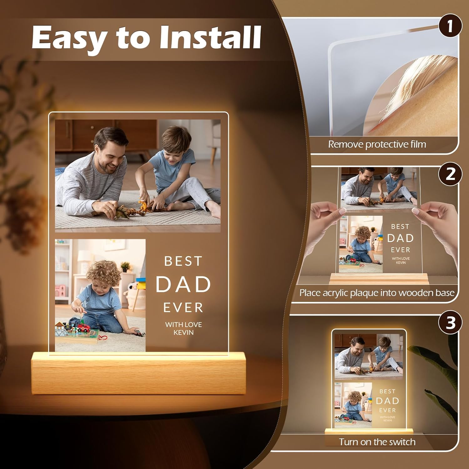 - Personalized Photo Frame with Night Light: Simply upload your favorite photos and add custom text to create a unique acrylic photo plaque with an integrated night light. This artistic display beautifully showcases your precious memories, adding a touch of romance and meaning to any space.
