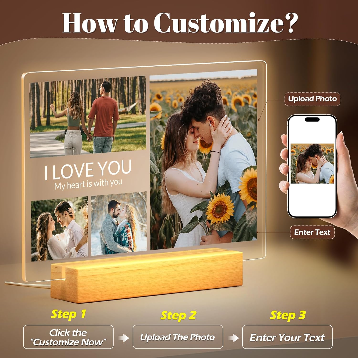 - Personalized Photo Frame with Night Light: Simply upload your favorite photos and add custom text to create a unique acrylic photo plaque with an integrated night light. This artistic display beautifully showcases your precious memories, adding a touch of romance and meaning to any space.