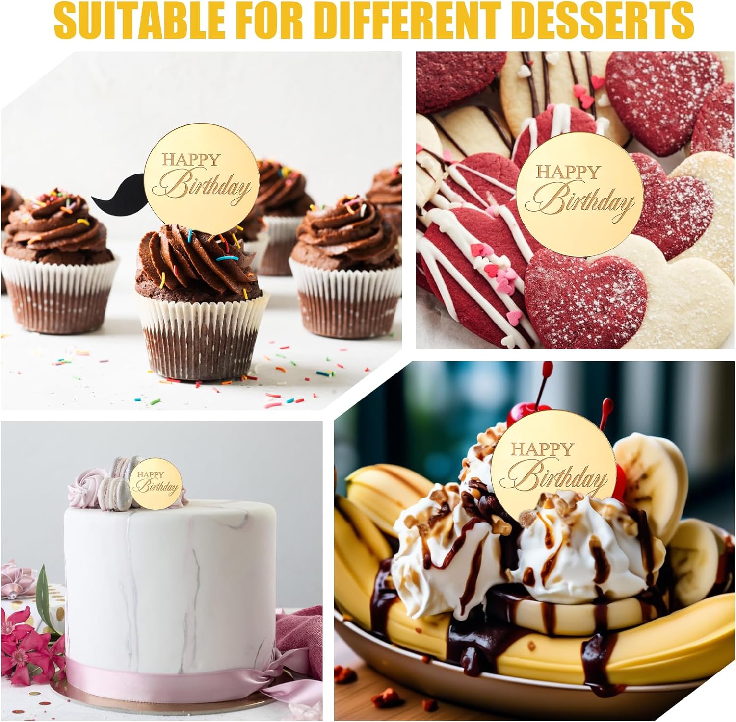 - 【Elegant Visual Enhancement】The gold mirror finish creates a reflective surface that elevates dessert presentations with modern sophistication. The engraved 'Happy Birthday' lettering appears clearly against the glossy background, making these cake decorations visually striking from all angles. This decorative effect transforms ordinary desserts into centerpiece attractions for special occasions