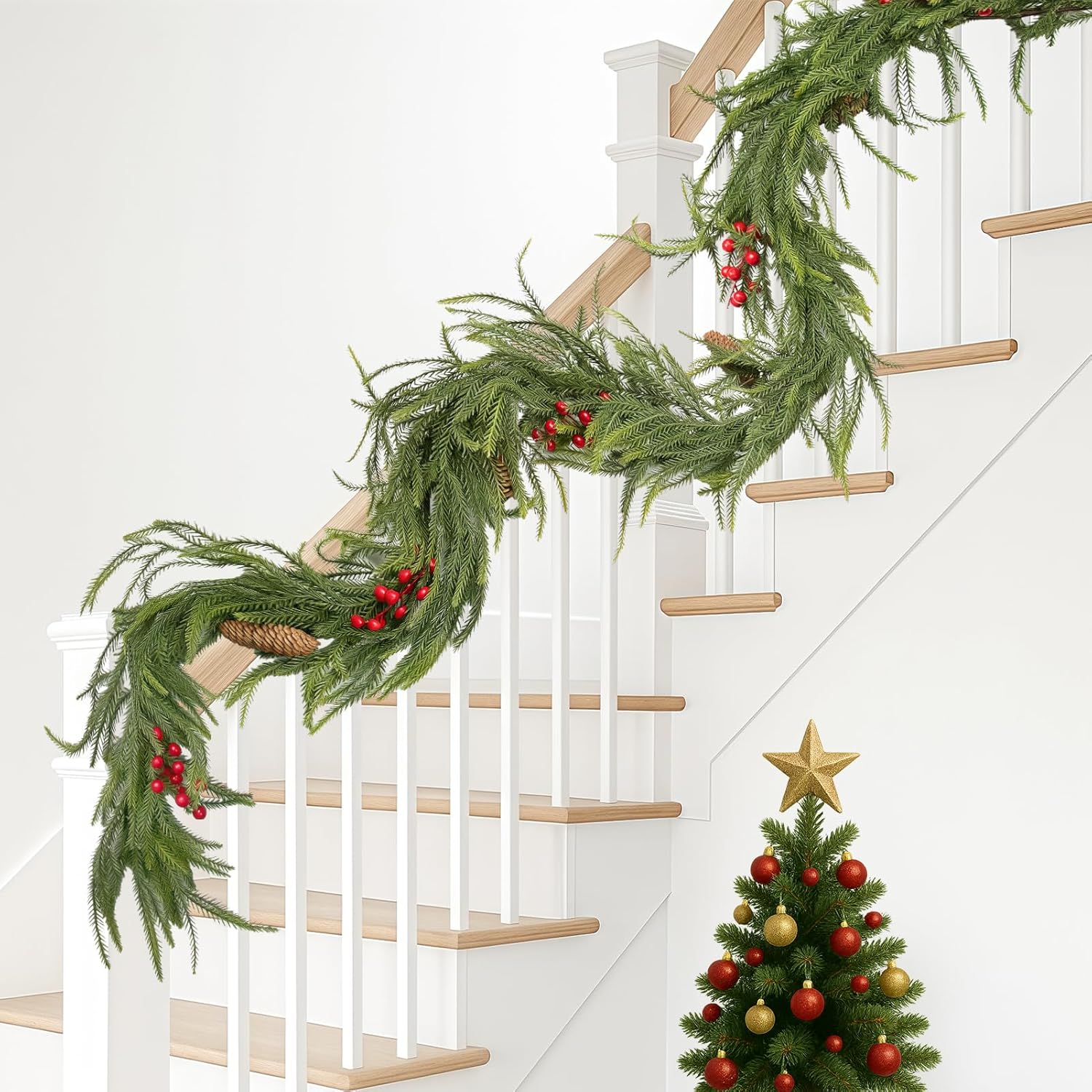 - UNIQUE, LUSH MIX: Norfolk pine garland layered with pine & cedar (cypress) tips and red berries for a rich, dimensional look. Measures 6 ft (72 in) in length; garland only—no lights included.