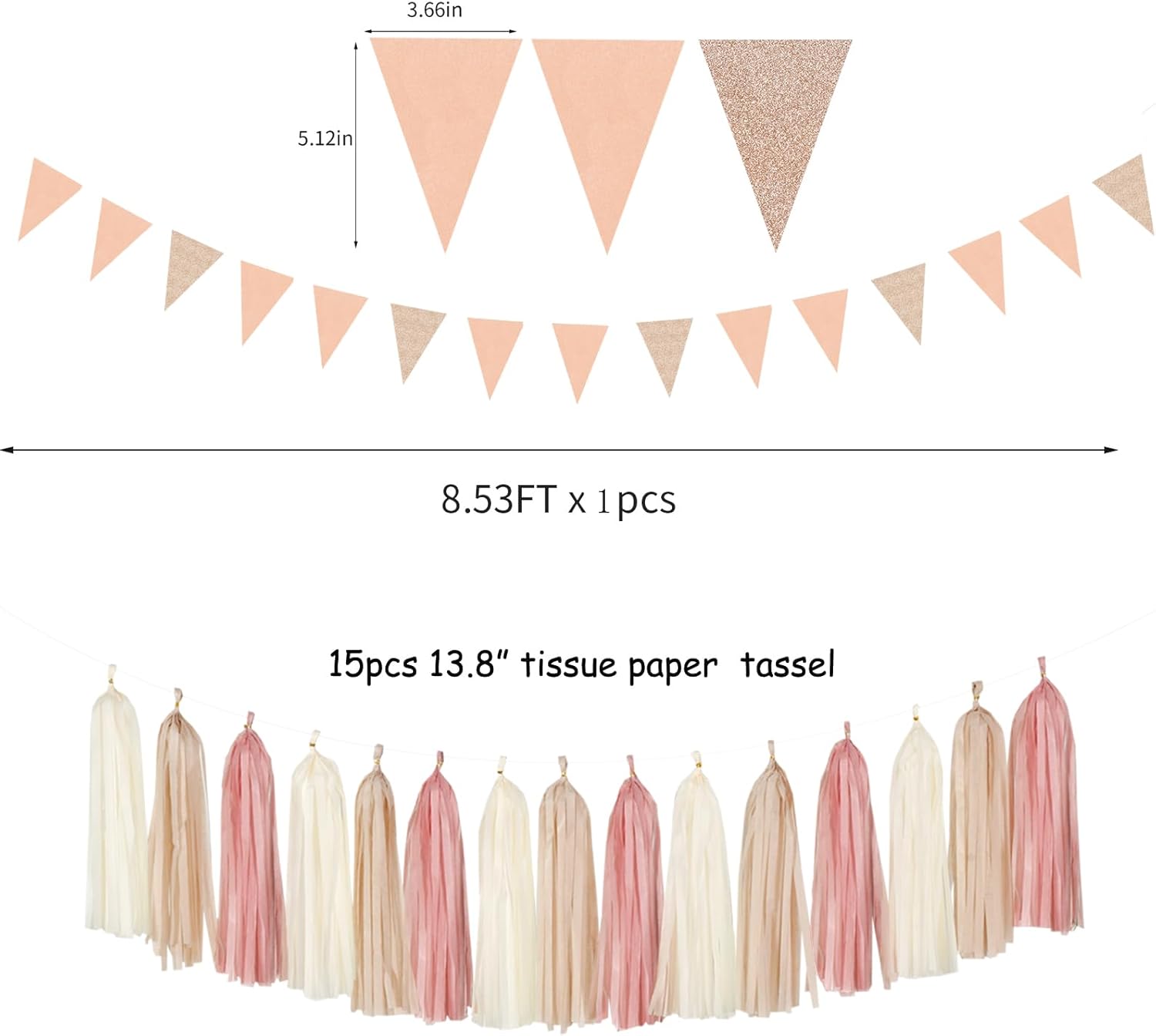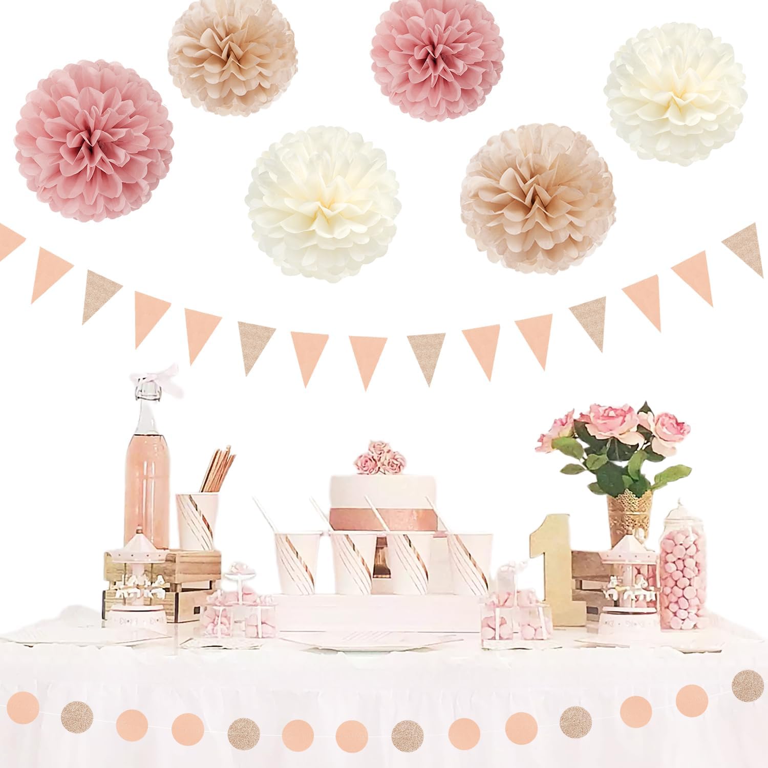 - 【Package Contains】The champagne beige pink peach rose gold party kits include 6pcs tissue paper flowers: 3pcs 8" and 3pcs 10" in three color, 1pcs Triangle Flags,1pcs circle dots paper garland,15pcs tassel garland. Total 23pcs.