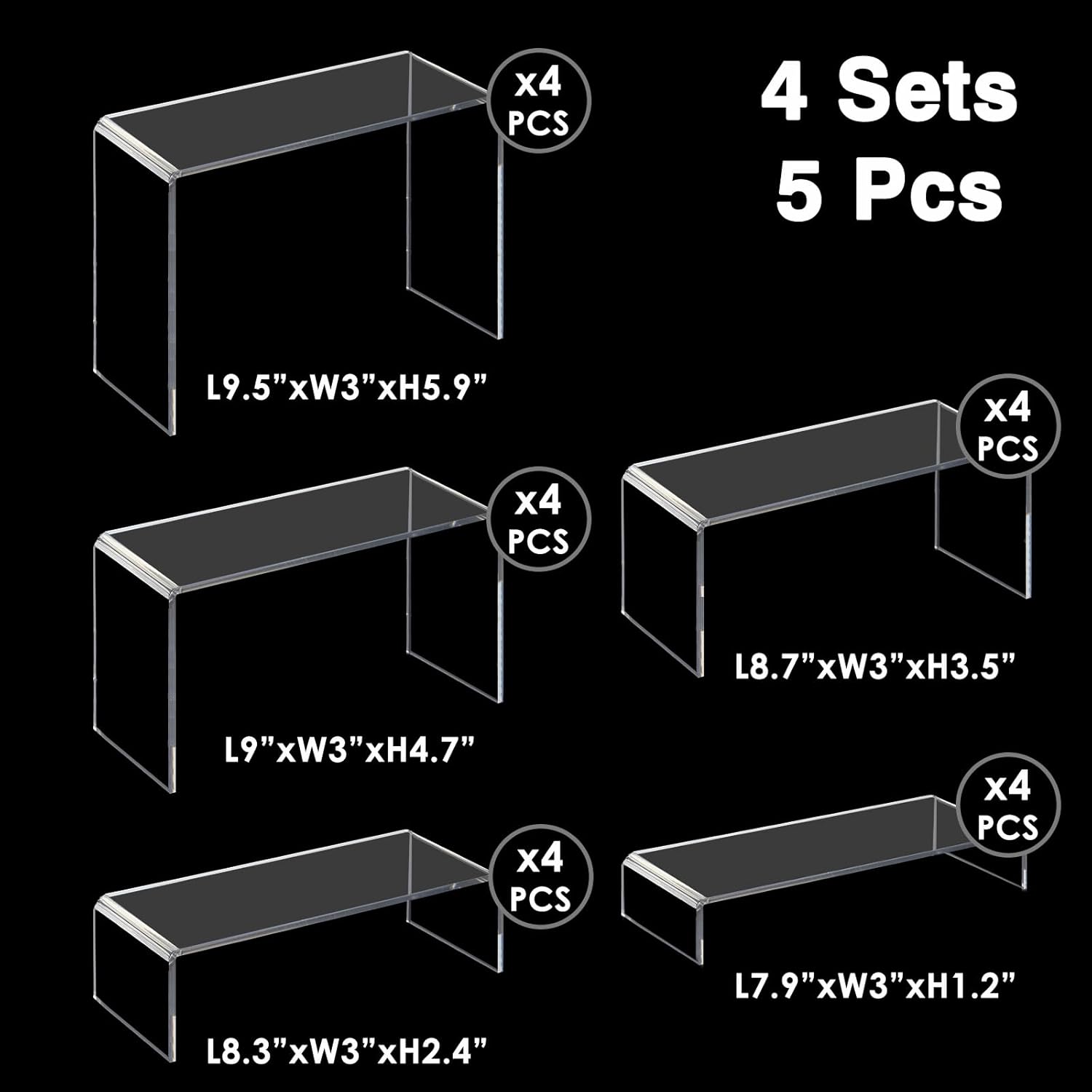 - 【Multiple Display Layers】With four different sizes (9.4x3x5.9in, 9x3x5in, 8.5x3x3.5in, 8.2x3x2.7in and 7.8x3x1.2in), each with 4-pieces, you'll have ample display layers to showcase your items.