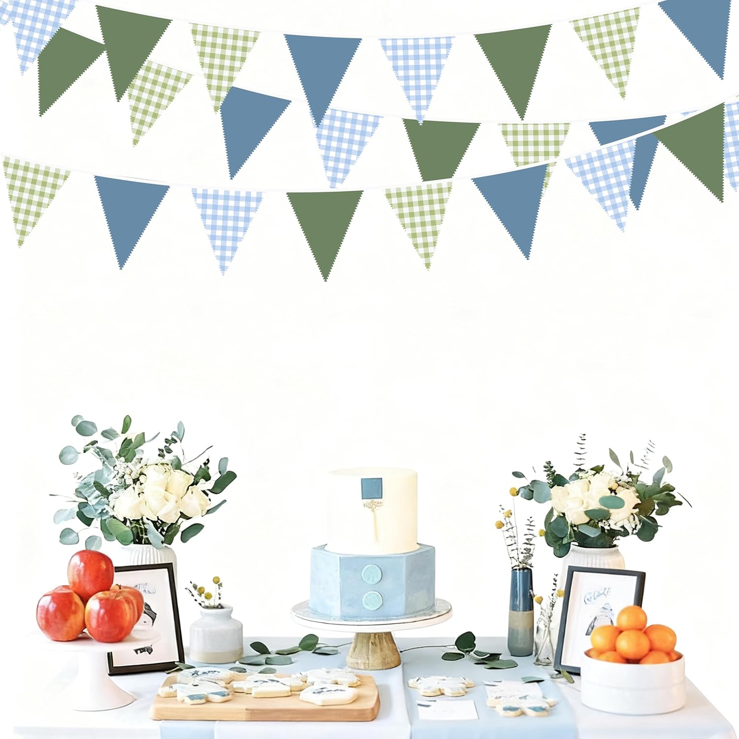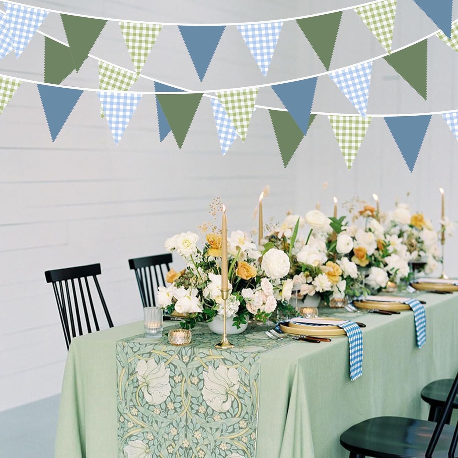 32Ft Blue Green Party Decorations Dusty Blue Sage Green Gingham Fabric Triangle Banner Flag Plaid Pennant Garland Streamers for Hole in One Birthday Baby Shower Masters Golf Graduation Decor Supplies