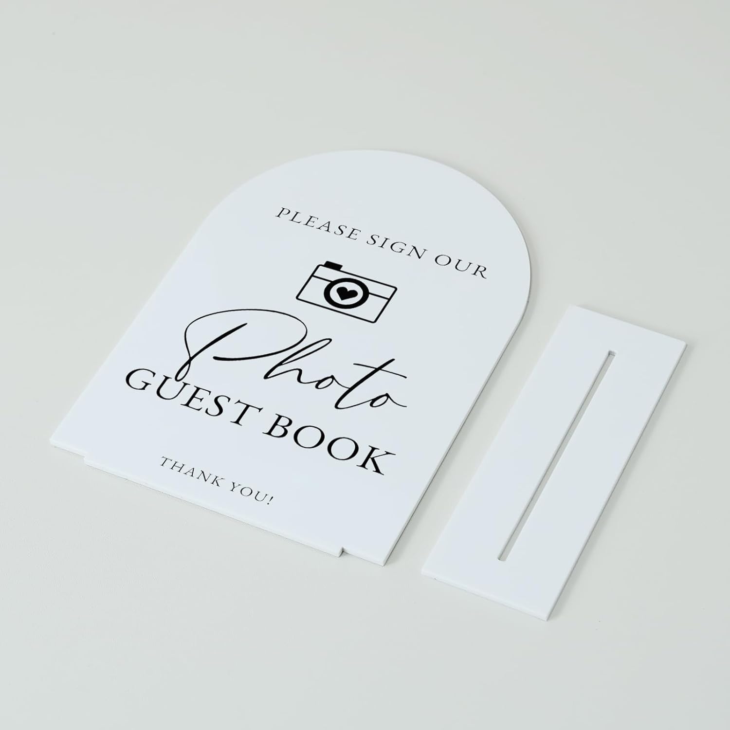 Acrylic Photo Guestbook with Stand- 5"x7" White Arched Wedding Sign and Base,1/8" Thick | Modern Calligraphy Black Lettering Arch Acrylic Sign for Wedding Reception & Party(5x7Inch, White)
