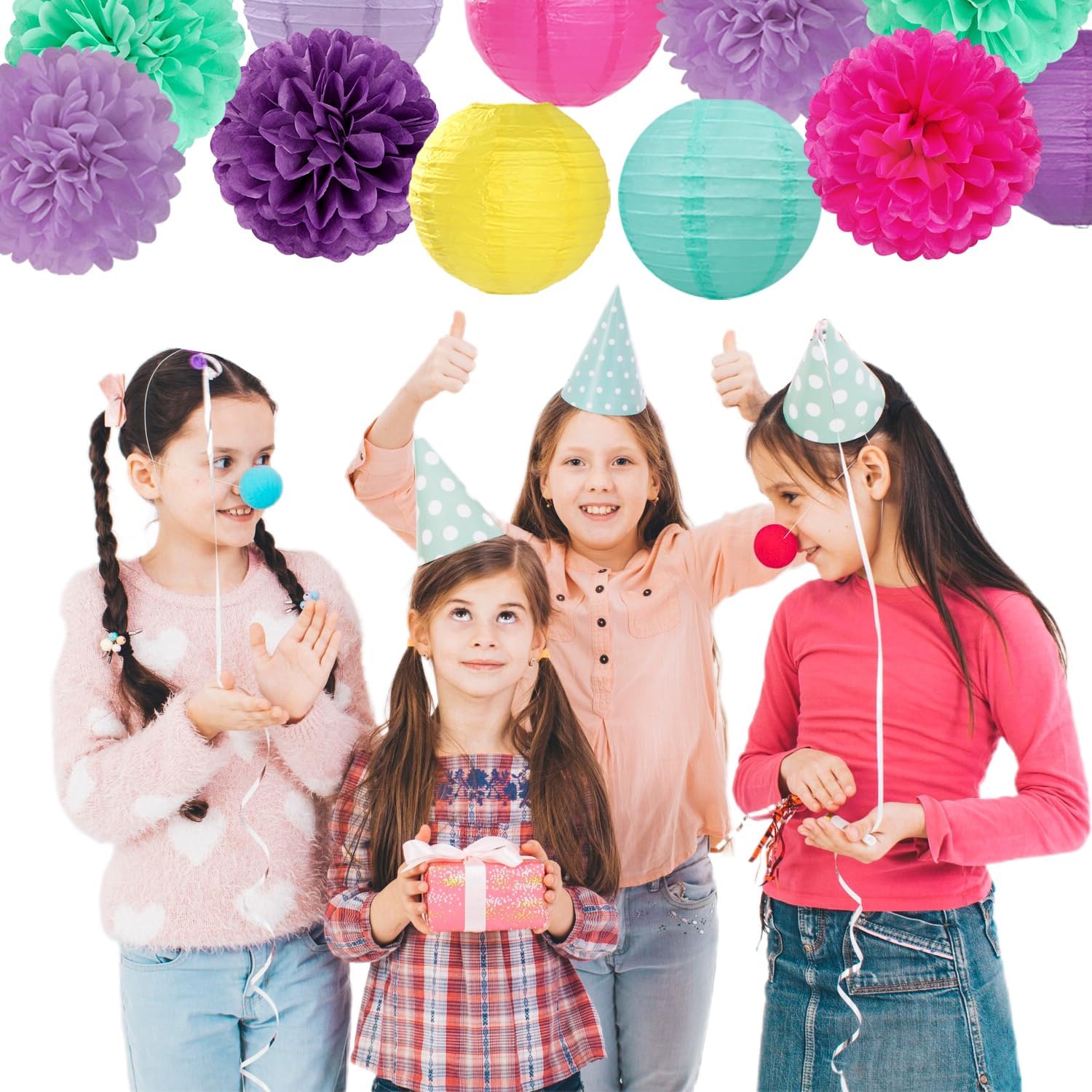 Hot-Pink Purple-Teal Yellow Paper-Flowers Lanterns - 15pc Kids Magic Theme Birthday Party Decorations Tissue Pom Poms Streamers,Bachelorette Bridal Baby Shower Engagement Wedding Decor Panduola